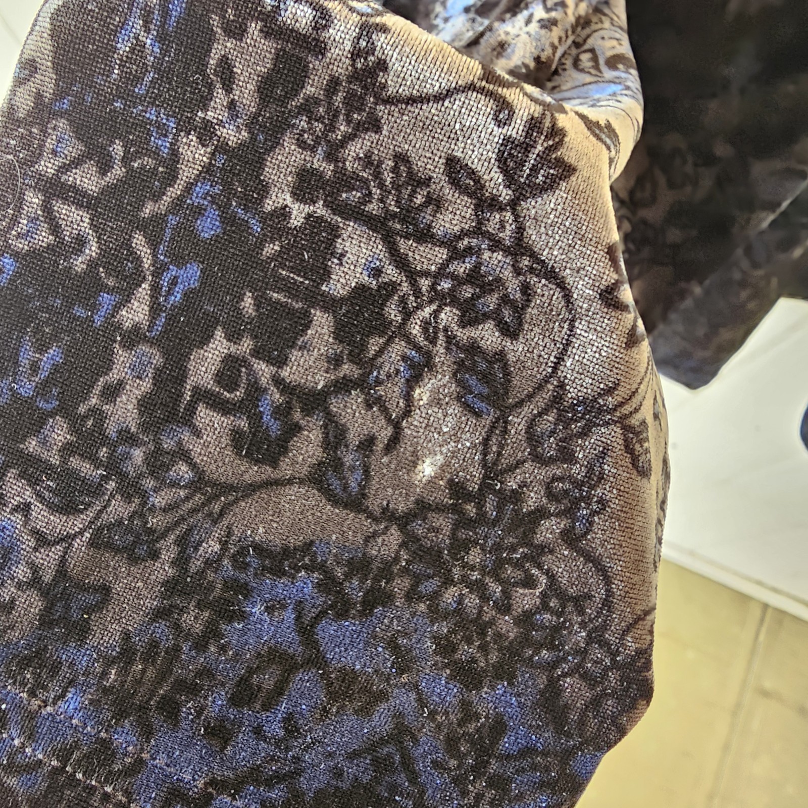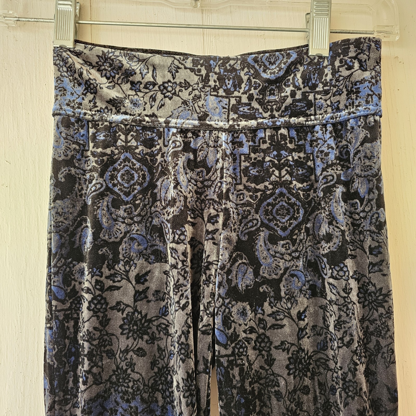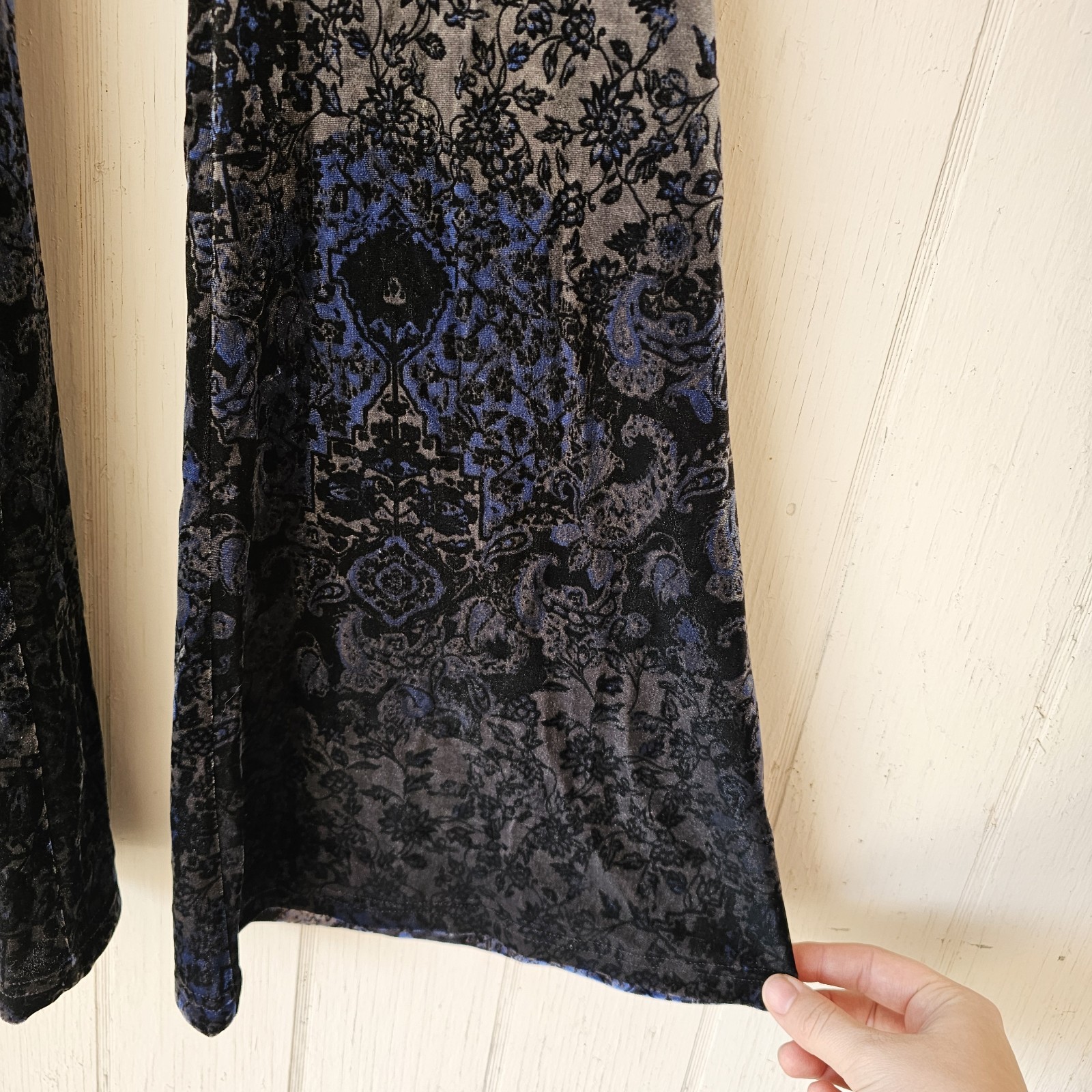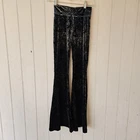 Sun & Shadow S Black Paisley Flare Velvet Pants Stretch Whimsigoth FairyGrunge. These pants are a unique piece to add to a wardrobe for someone who loves mystery. At glance, they appear to be dark colored but when the light catches them, details of Paisley and silver like colors pop out and catch the eye. These pants are pre-owned and in good condition. The seams on the inside of the waistband are loose and there are two small holes on one of the pant legs. They are hard to see from the front but on the inside of the pant leg, they can be seen, see pictures for details. The tag on these pants is sized at a small, the flats measurements are as follows: Waist: 10 1/2 in Rise: 8 in Inseam: 31 1/4 in