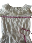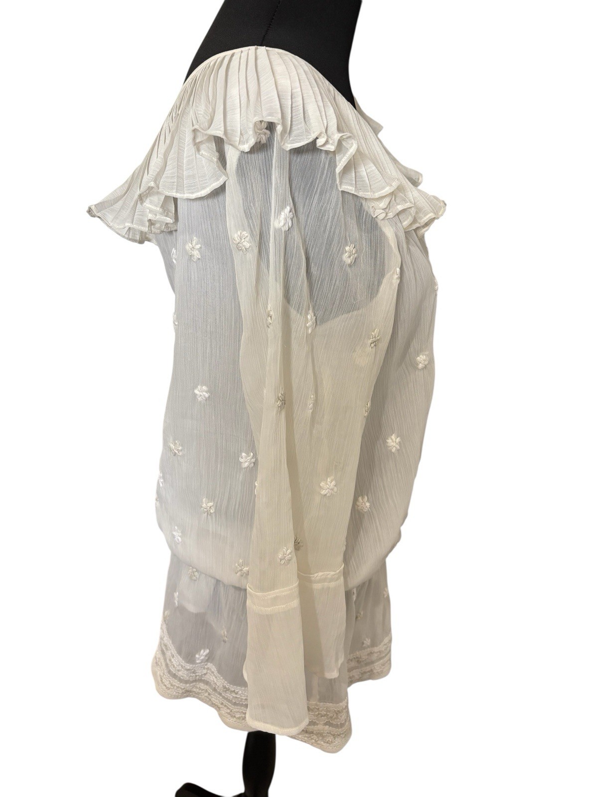 The Sundance Women's Ivory Sheer Boho Blouse features a pleated ruffle neck and embroidered floral accents, adding a touch of whimsy to the casual long sleeve blouse. Made of polyester, this tunic-style blouse in a size M is perfect for the summer and spring seasons. With a scoop neckline and a regular fit, this breathable blouse from Sundance is a stylish choice for women looking for a peasant-themed top for their wardrobe. Elastic waist and lace trim at hem. Lined. Excellent preowned condition, no flaws found Measurements (approx): Chest: 19.5” pit to pit Length: 28” 100% polyester Hand wash/ line dry