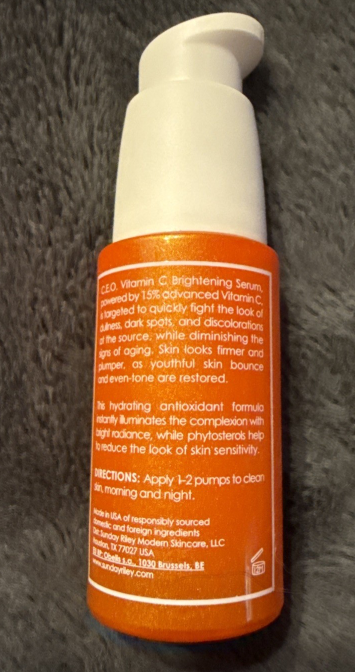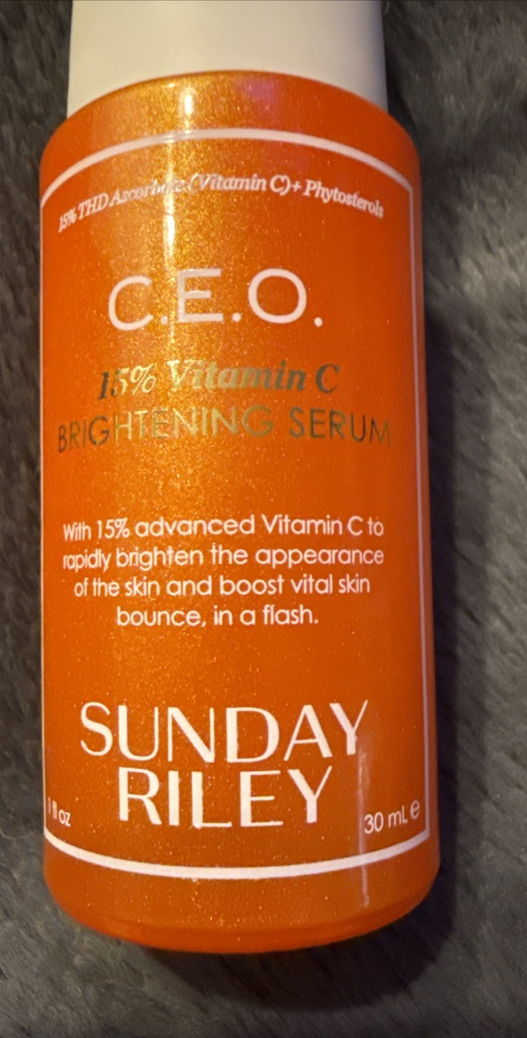 Sunday Riley C.E.O. 15% Vitamin C Brightening Serum is a lightweight, hydrating serum formulated with 15% THD Ascorbate, a stable form of vitamin C, to brighten skin and reduce signs of aging. It also contains glycolic acid for gentle exfoliation and squalane for moisture