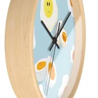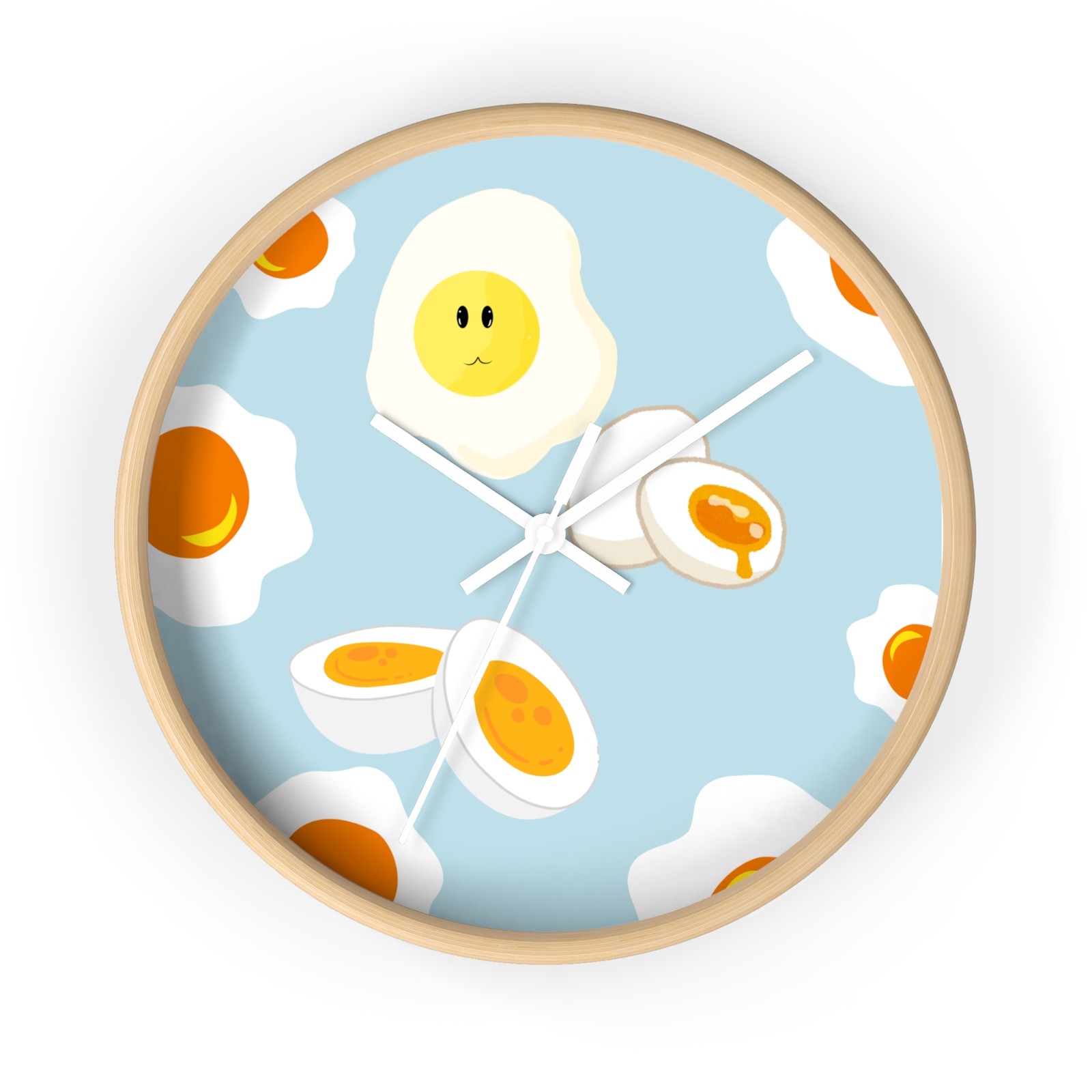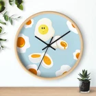 Add a whimsical touch to your space with this charming wall clock. Featuring a delightful design of sunny-side-up eggs against a soft blue background, this clock effortlessly blends functionality with fun. Perfect for kitchens, dining areas, or children’s rooms, it brings a playful vibe that brightens your day. Crafted with vibrant colors and a sleek wooden frame, it makes a great gift for food lovers, children, or anyone who appreciates unique home decor. Celebrate special occasions like housewarmings, birthdays, or holidays with this functional art piece! Product features - Available in natural wood, black, and white frame variations. - Includes a built-in hook for easy hanging. - Bright and vibrant colors achieved with advanced printing techniques. - Crafted from 100% wood, plexiglass, and metal components. - Compact size: 10" x 10" (25.4 x 25.4 cm). Care instructions - Wipe the dust off gently with a clean, dry microfiber cloth