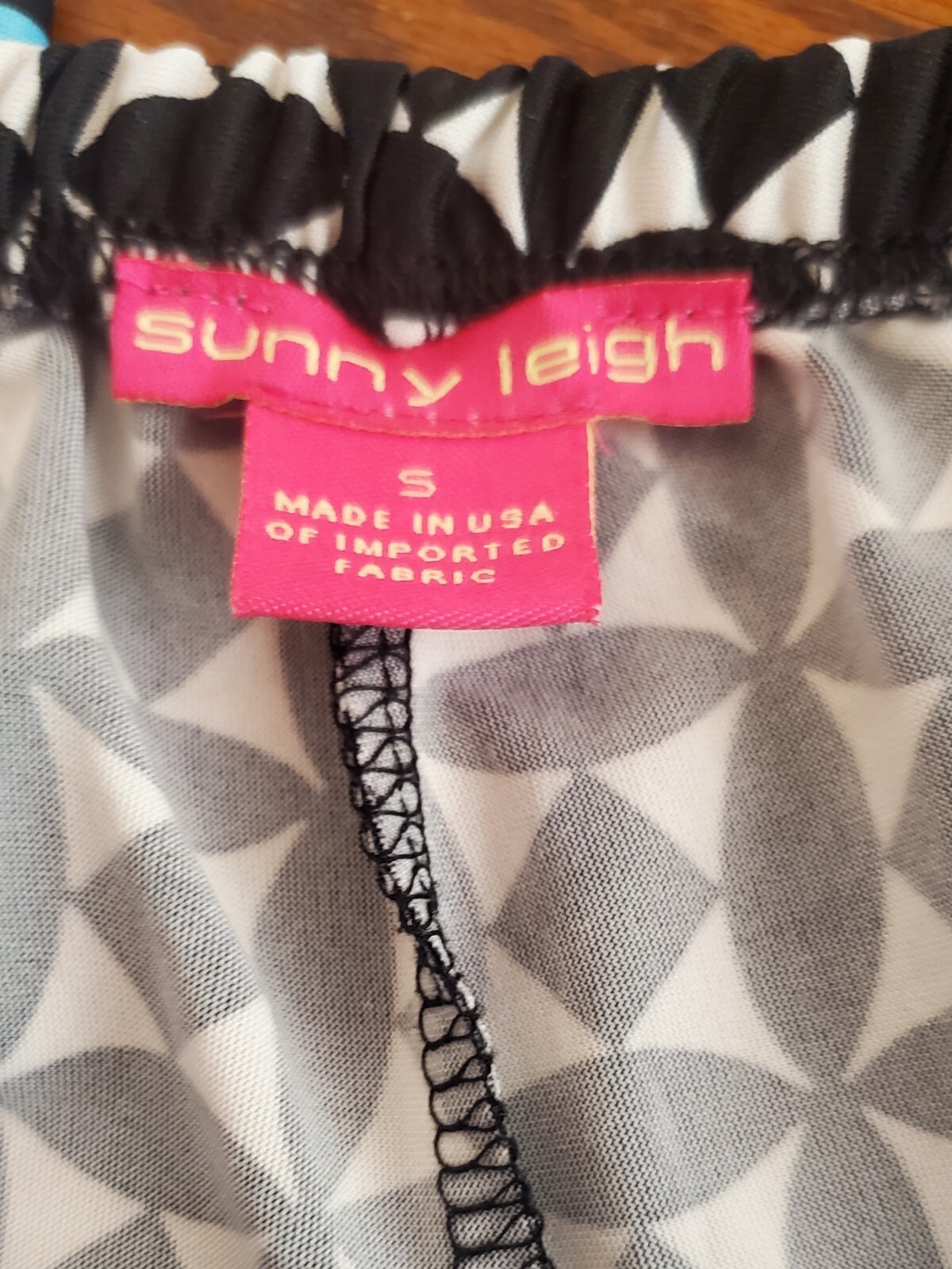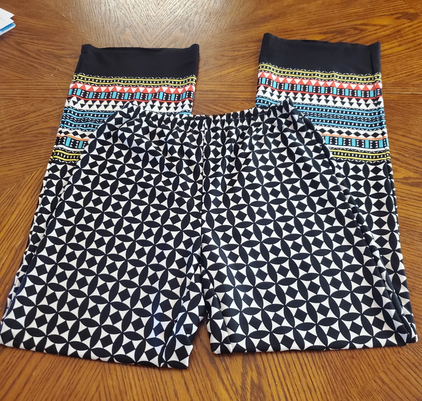 ❤️READ MEASUREMENTS FOR FIT ❤️ Sunny Leigh Flowy Pallazzo Style Resort Pants Elastic Waist Women's S Pre-owned. Beautiful, colorful, and comfortable pants with elastic waist. Pretty patterns of black and white geometric shapes and colorful bands of color print at hem. Laying flat pants measure 13" from side to side at waist, 41.5" from waistband to hem, and 32" inseam. ALL MEASUREMENTS ARE APPROXIMATE Very good Pre-owned condition. ❤️READ MEASUREMENTS FOR FIT ❤️