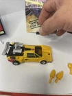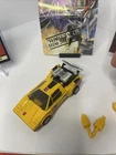 Takara G1 Transformers Sunstreaker figure from 1985, along with its accessories and instruction booklet. Sunstreaker is a yellow Lamborghini Countach and one of the original Autobot cars from the Generation 1 Transformers toy line. The figure is complete with all its accessories, including the missile launchers, and tech spec. The instruction booklet is also present, which is a bonus for collectors. Key features of this Sunstreaker figure: Vehicle Mode: Transforms into a yellow Lamborghini Countach. Accessories: Includes missiles. Instruction Booklet: Comes with the original instruction booklet. Year of Release: 1985. Manufacturer: Takara (originally), later released by Hasbro. Faction: Autobot. Character Function: Warrior. Tech Spec Description: "The conceited Sunstreaker thinks he is the most beautiful thing on Earth, loves his sleek styling, and is contemptuous of other Autobots. He fires laser-guided ground-to-air rockets and high-energy electron pulses at 300 bursts/sec. His tough polymer-steel skin resists artillery. Not a team player, he can be baited into dangerous situations, but is a very calm, competent, and ruthless war machine". The product is a vintage G1 Transformers Sunstreaker action figure from 1985, manufactured by Takara in Japan. It is part of the original Transformers franchise, specifically from the Generation One series. The figure features a yellow color, Lamborghini Countach vehicle type, and is made of chrome, plastic, and metal materials. It is a 100% complete item with all paperwork, and is part of the Autobot faction. The figure transforms and is a part of the Transformers TV show and movie series. This collectible item is a must-have for fans of vintage Transformers toys.