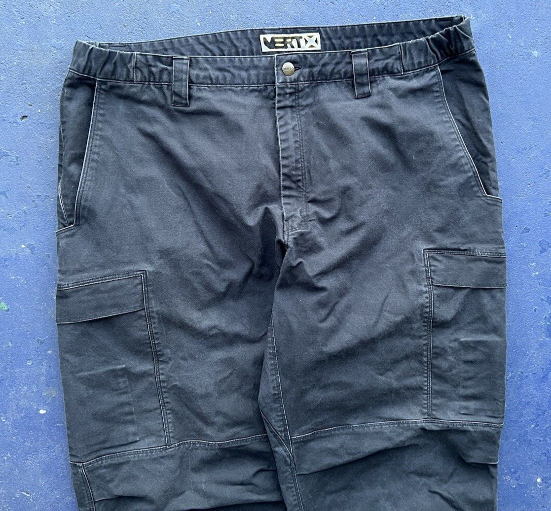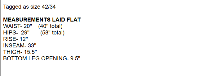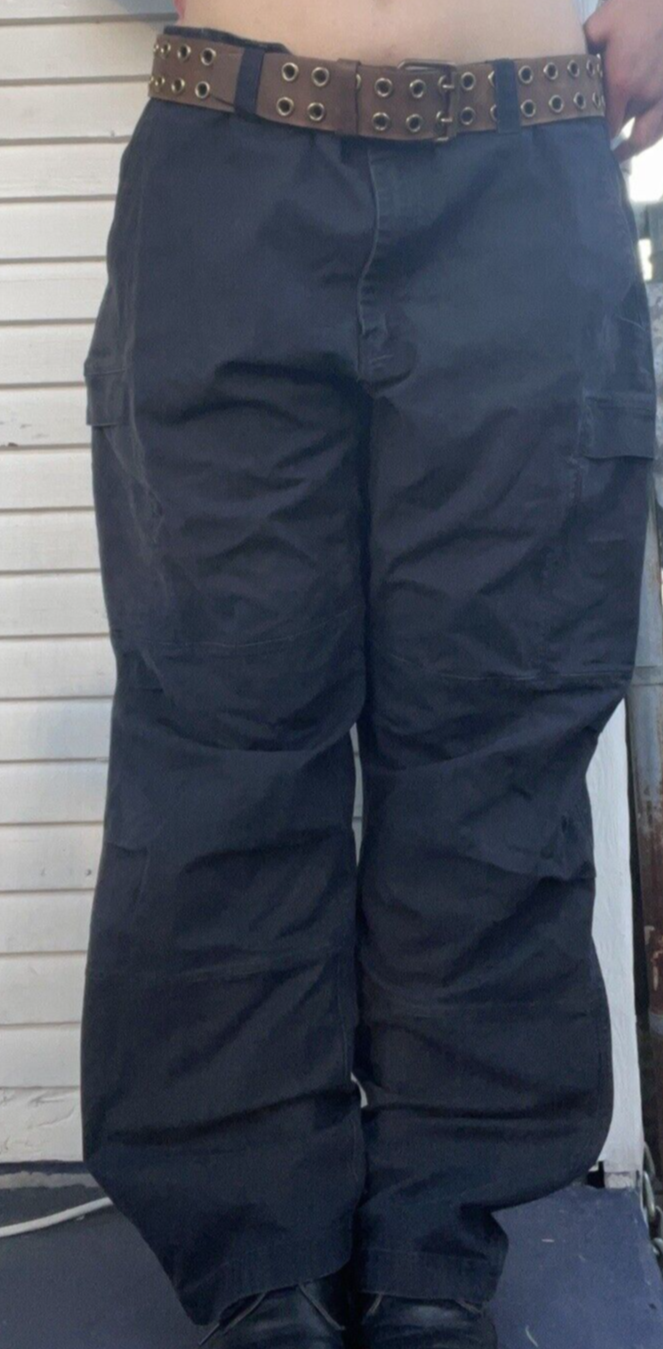 In good used condition with some general wear all over. Faded black color from wear but no large structural flaws/defects are visible. Please see photos for exact condition details. Tagged as size 42/34 MEASUREMENTS LAID FLAT WAIST- 20'' (40'' total) HIPS- 29'' (58'' total) RISE- 12'' INSEAM- 33'' THIGH- 15.5'' BOTTOM LEG OPENING- 9.5'' In good used condition with some general wear all over. No large structural flaws/defects are visible. Please see photos for exact condition details.