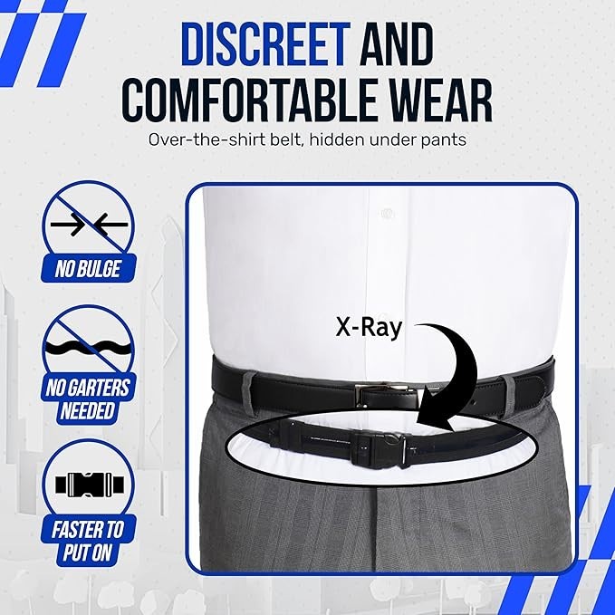 Handcrafted in the USA – Superior quality shirt stay designed to keep your dress shirt perfectly tucked all day. Ideal for professionals, especially those in law enforcement. Durable Design – Made with tough materials, our Super Belt features silicone grips that hold shirts securely, even during strenuous activities. Versatile for Any Occasion – Perfect for both formal and professional attire, this one-size-fits-all black belt ensures a neat, tucked-in look for any man. Comfortable and Adjustable Fit – The one-size-fits-all Super Belt provides a snug, adjustable fit, ensuring comfort during long hours of wear for men in high-intensity jobs. Non-Slip Silicone Grips – Equipped with durable silicone shirt holders, this belt keeps your shirt in place without slipping or bunching, making it a reliable choice for both formal occasions and everyday use. Fits up to 45/46" waist