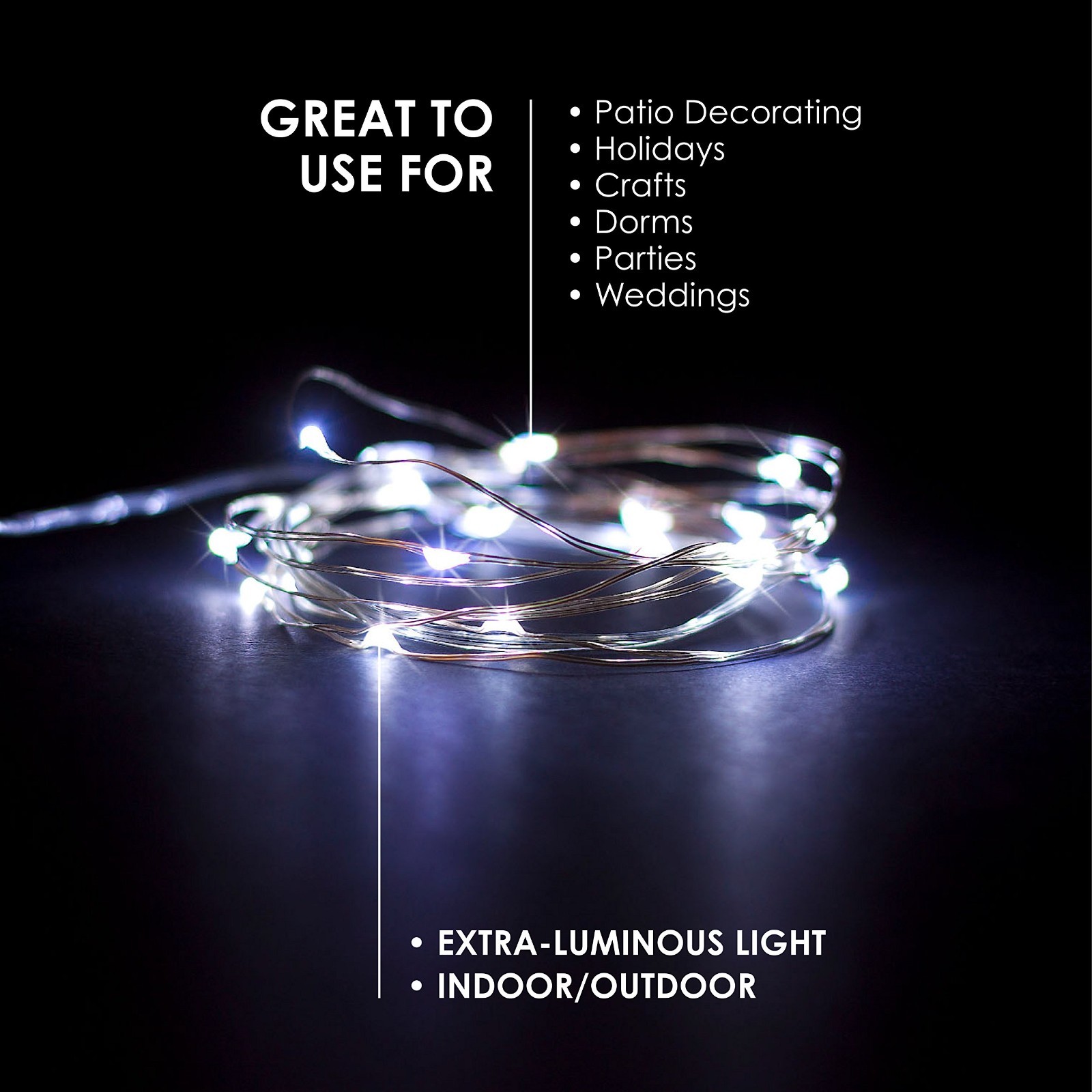 Super Bright LED String Fairy Lights - Battery Operated with Timer for Indoor Outdoor Decor Transform any space instantly with these vibrant, energy-efficient Micro LED string lights. Perfect for adding a magical glow to holidays, special events, or everyday home decoration. Their ultra-thin, bendable wire makes them easy to install and shape anywhere you need a touch of sparkle! Key Features & Benefits Ultra-Luminous Micro LEDs: Features super bright LED bulbs (about the size of a rice grain) providing 360-degree illumination for maximum impact. Integrated Timer Function: Enjoy set-and-forget lighting with the 6 Hours ON / 18 Hours OFF automatic timer mode, ensuring effortless ambiance and conserving battery life. Flexible & Durable Wire: Constructed with ultra-thin, yet sturdy silver-colored wire that can be easily shaped, bent, and wrapped around patios, furniture, and vases. Indoor/Outdoor Versatility: Designed for use in all indoor spaces and covered outdoor areas, ideal for bedrooms, gardens, and porches. Submersible Wire: The light string itself is completely submersible (battery box must remain dry), perfect for enhancing centerpieces or water features. Energy Efficient: LED technology offers an extremely long lifespan and uses a fraction of the power of regular light strings. Technical Specifications Light Source: Super Bright Micro LED Bulbs Wire Construction: Ultra-Thin, Silver-Tone Wire Power Source: Battery Operated (AA batteries required, not included) Control Modes: ON / OFF / TIMER (6 Hours On / 18 Hours Off) Visibility: Steady 360-degree viewing angle Versatile Use Cases Create a beautiful atmosphere for any occasion: Use these starry lights to effortlessly decorate: Bedrooms, Mirrors, and Headboards Mason Jars and Table Centerpieces Holiday Displays (Christmas, Easter, Halloween) Patios, Decks, and Gazebos Wedding and Party Decorations Light up your life with dazzling, hassle-free illumination!