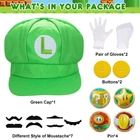 【What You Get】Green (L) Cap x 1, Fake Mustaches of different styles x 7, 1 pairs of White Nylon Gloves, 1.2''(3cm) Yellow Buttons x 2, Cartoon Buttoon Pins x 4. 【Size】One Size fits most adults. The head circumference is about 58-60cm/22.83-23.62Inch, Unisex. 【Easy to Wear Design】Our hat is built-In elastic band, more convenient to Wear, self-adhesive faux mustache, The big buttons is allow to be sewn or glued. 【Classical】It's a funny 80's retro plumber gaming outfit accessories. Best costume and prop for Halloween, Christmas, Cosplay, Carnival, fancy dress or any other role play occasions. 【Buy with Confidence】If you have any unhappiness about this purchase, please do not hesitate to contact us,we promise solve for you within 24h.