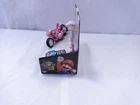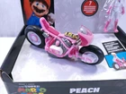 The Peach figure has unique articulation that allows her to sit on her motorcycle. Pull back and watch her go! The Super Mario Bros. Movie 2.5 inch Re-moveable Peach Action figure with 7 points of articulation Pull back motorcycle racer Ages 3+ Batteries not required New Box have some dent on bottom
