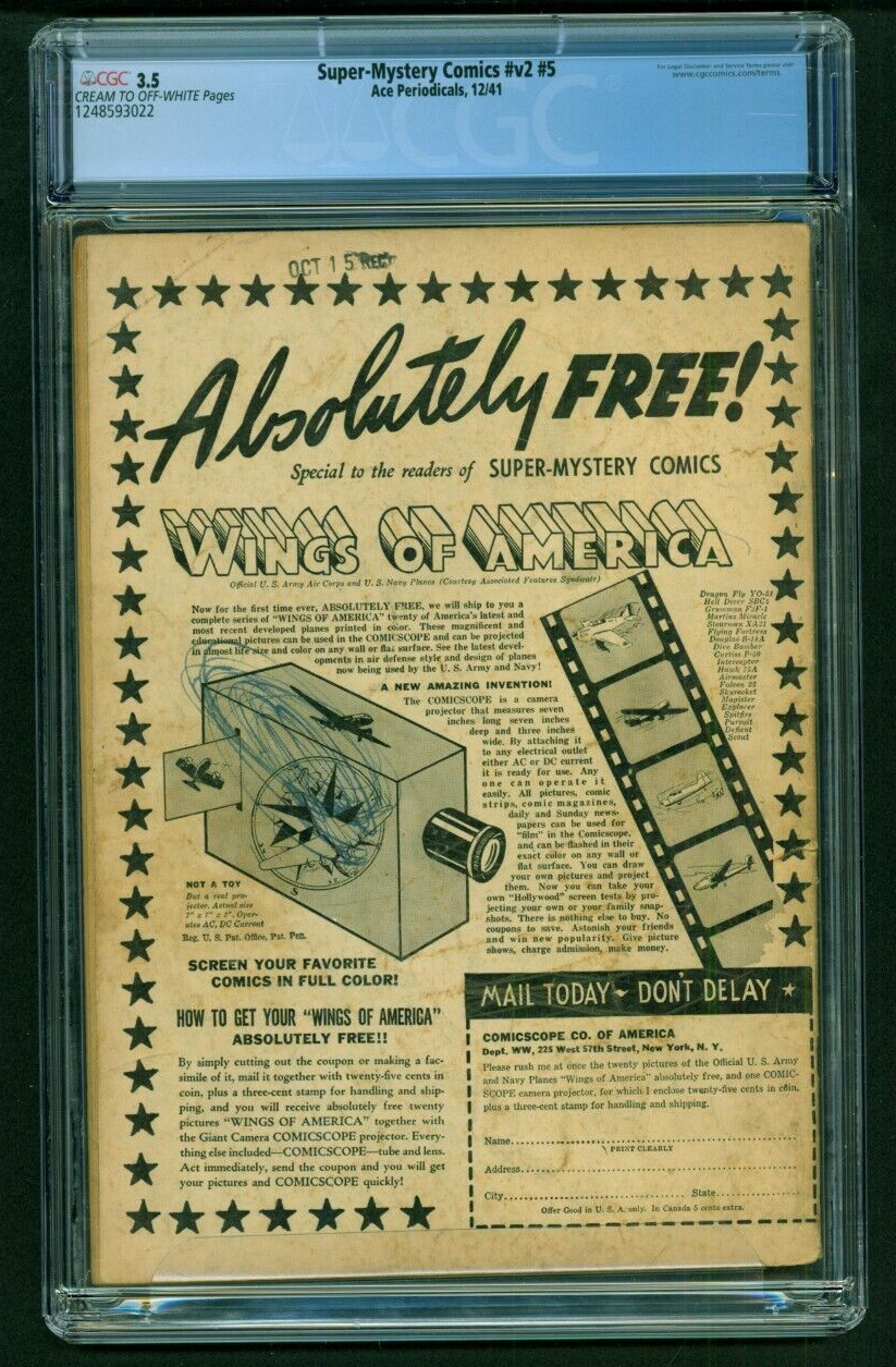 Vintage:YesUnit of Sale:Single UnitPublication Year:1941Grade:3.5 Very Good-Tradition:US ComicsEra:Golden Age (1938-55)Artist/Writer:Jim MooneyLanguage:EnglishPublisher:ACE ComicsProfessional Grader:Certified Guaranty Company (CGC)Issue Number:2Series Title:Super Mystery ComicsType:Comic Book