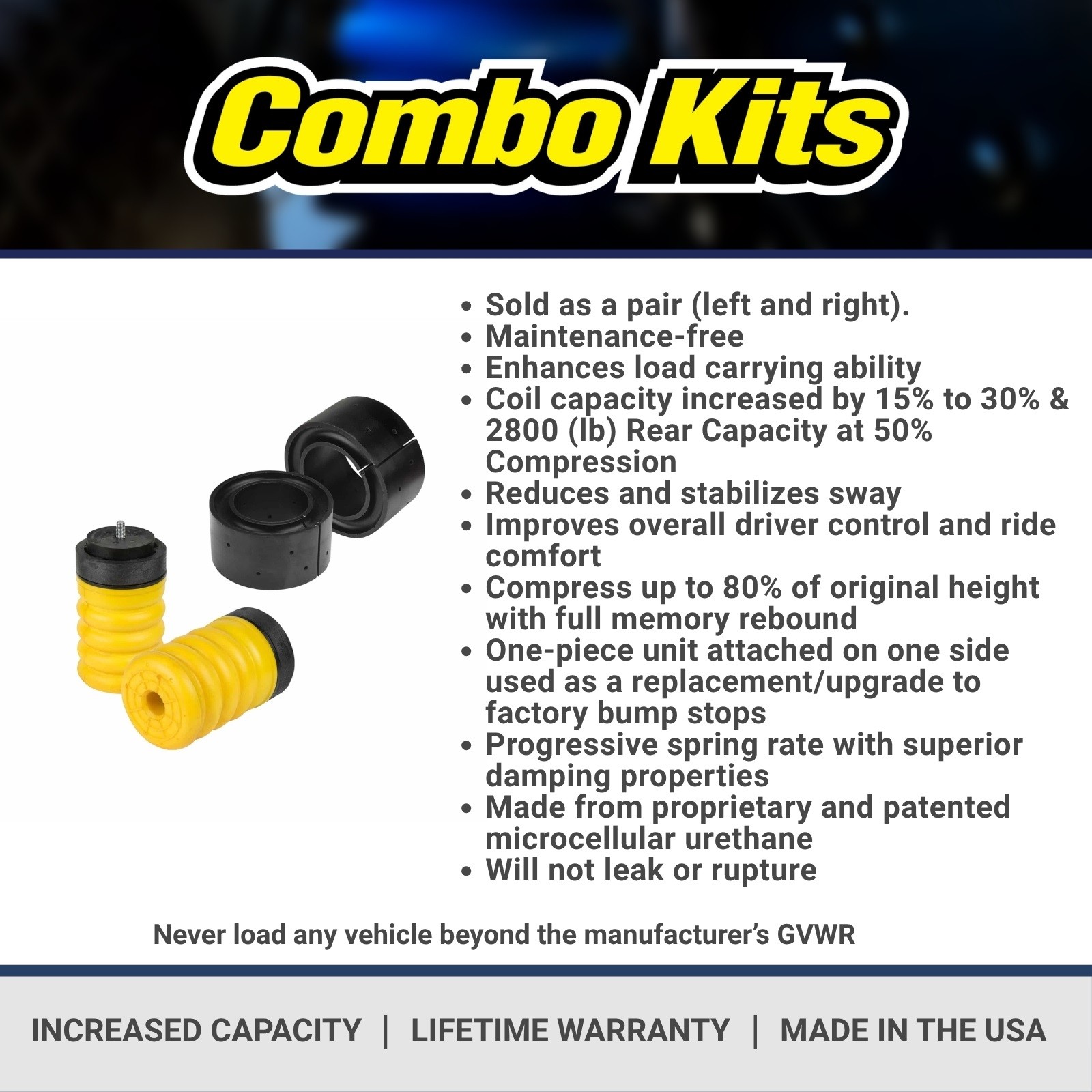 https://ebaystores.s3.us-east-2.amazonaws.com/trendsauto/SuperSprings/SUPERSPRINGS-K-10-008-01.jpg SuperSprings, Super Springs, K-10-008, Front Suspension, Rear Suspension, SumoSprings, Sumo Springs, Front Springs, Rear Springs, Ford Transit, Transit-350, Transit Suspension, Air Spring, Helper Spring SuperSprings Air Suspension SumoSprings Helper Springs for 15-25 Transit-350 2WD PART NUMBER: K-10-008 BRAND: SuperSprings DESCRIPTION SumoSprings are not made from rubber. They are a progressive spring with a very soft initial engagement. That means that as more weight added, the harder they get and more they push back, providing support and control when you need it without affecting the factory ride when unloaded. These are a suspension enhancement built to create a better journey. Manufactured from micro-cellular polyurethane, they are designed to reduce rear-end sag, decrease vibration, stabilize sway, and soften harsh rebounds. Sold as a pair (left and right). Maintenance-free Enhances load carrying ability Coil capacity increased by 15% to 30% & 2800 (lb) Rear Capacity at 50% Compression Reduces and stabilizes sway Improves overall driver control and ride comfort Compress up to 80% of original height with full memory rebound One-piece unit attached on one side used as a replacement/upgrade to factory bump stops Progressive spring rate with superior damping properties Made from proprietary and patented microcellular urethane Will not leak or rupture Never load any vehicle beyond the manufacturer’s GVWR Never load any vehicle beyond the manufacturer's GVWR VEHICLE COMPATIBILITY 2015-2025 Ford Transit-350 4x2