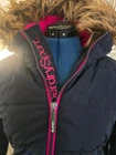 Polar Sports Puffer Jacket Superdry women's Polar Sports Puffer jacket. Keep warm with this quilted jacket, featuring a faux fur trimmed hood, a full fleece lining, a zip front fastening and two zipped front pockets. The Polar Sports Puffer jacket also features ribbed cuffss and is finished with an embroidered Superdry logo and a Superdry logo badge on the sleeve BLUE WITH PINK TRIM SIZE SMALL SUPERDRY ARE SMALL FITTING SO CHECK MEASUREMENTS PIT-PIT 18" LENGTH 23"
