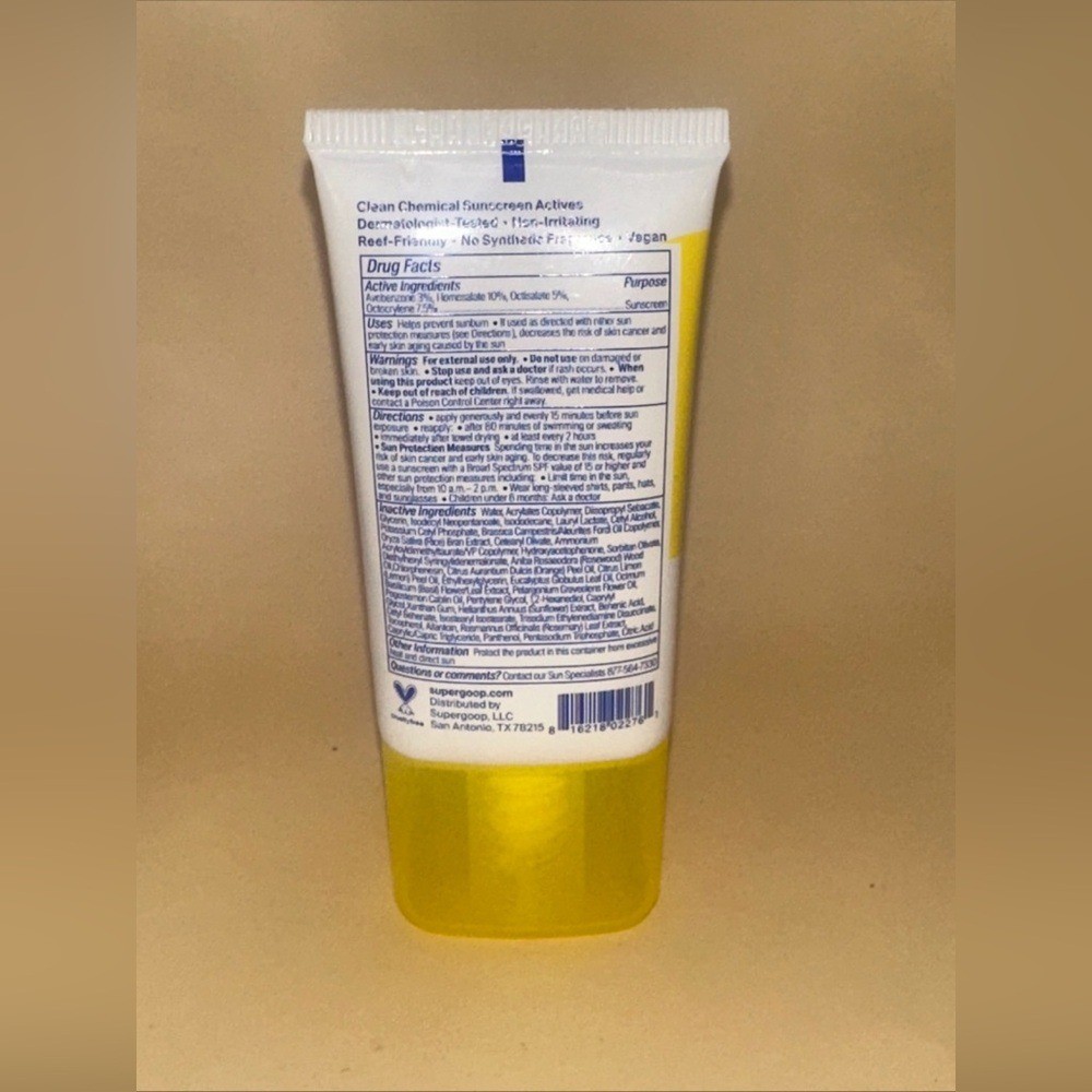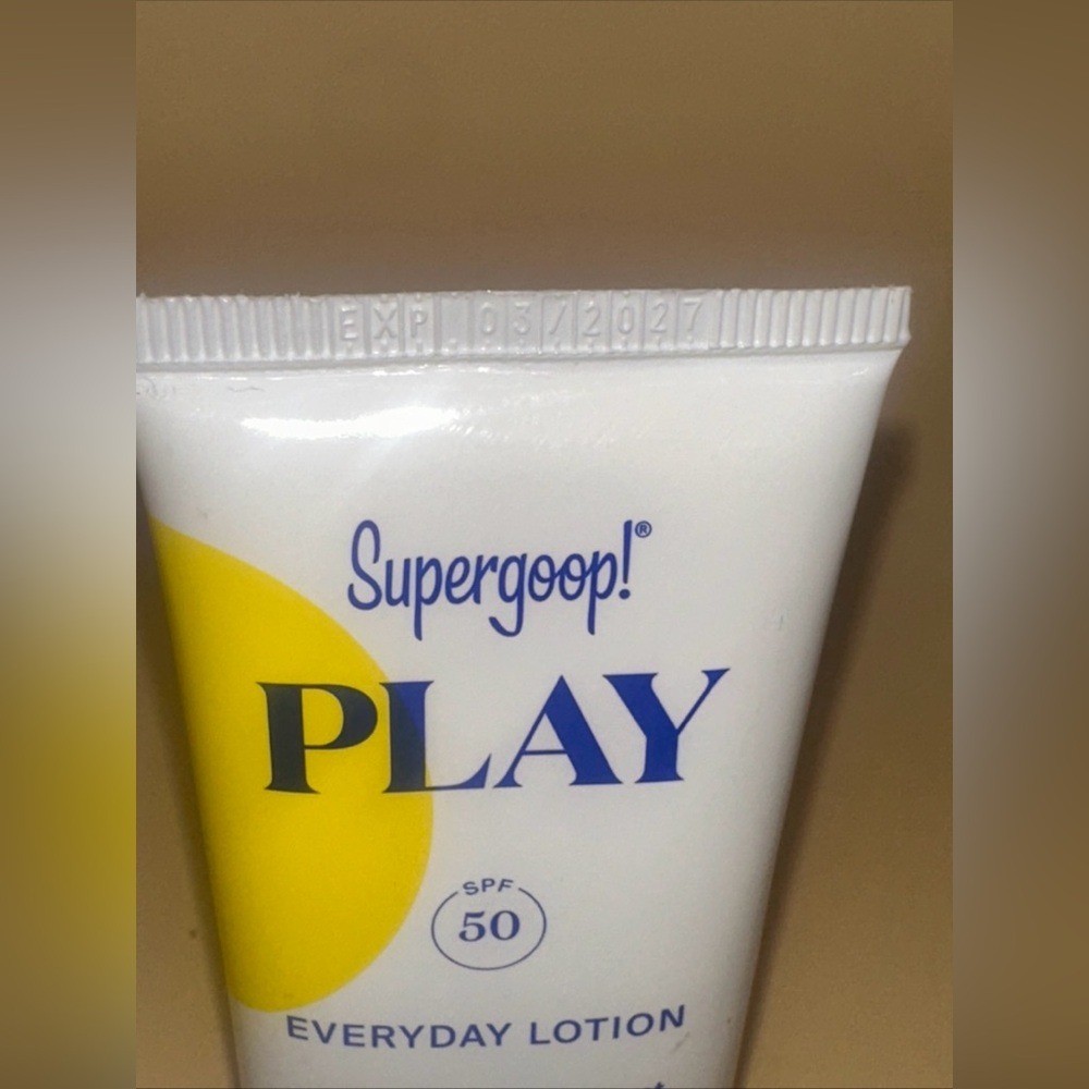 Supergoop! Play Everyday Lotion with SPF 50. Offers reliable sun protection. Bright yellow and blue design.