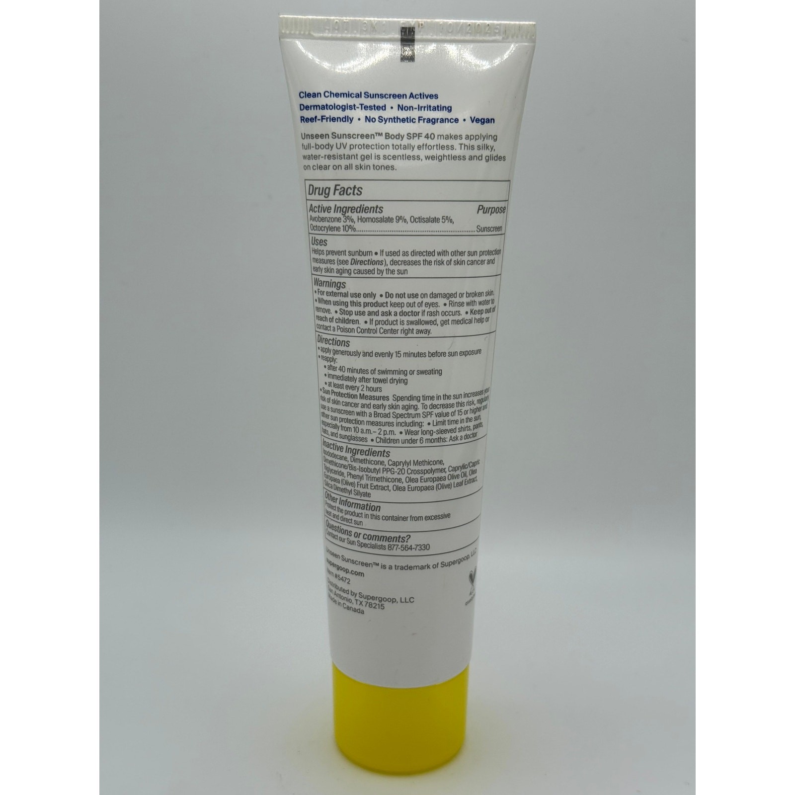 Supergoop Unseen Sunscreen Body SPF 40 Water & Sweat Resistant 3.4 fl oz/100ml Description: New without Box EXP: 10/25 WHAT IT IS: This invisible SPF for body takes our bestselling Unseen Sunscreen from head to toe! With a silky, nourishing, glide-able gel formula, this innovative SPF delivers the moisturizing, fast-absorbing power of our #1 bestseller for face & optimizes it for your body’s unique skincare needs. HOW TO USE: Apply generously and evenly as the last step in your skincare routine and 15 minutes before sun exposure. WHO IT IS FOR: All Skin Types