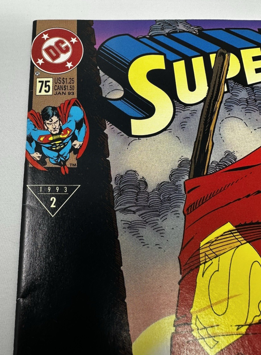 This listing is for Superman #75 (1992) – 1st Print , the historic Death of Superman issue that became one of the biggest comic events of the 1990s. This is not the black polybag edition—this is the original newsstand-style cover with the UPC barcode. Ships bagged and boarded in a rigid Gemini-style protector.