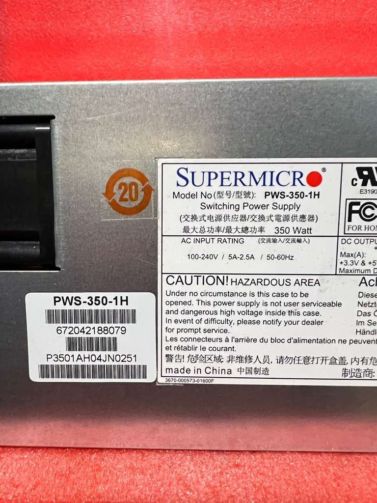 Supermicro PWS-350-1H 350W 1U Multi-Output Power Supply Condition: Used and Tested. INPUT CHARACTERISTICS RATED VOLTAGE / CURRENT 100-240Vac / 5-2.5A RATED FREQUENCY 50-60HZ INRUSH CURRENT Less than 30A POWER FACTOR 0.99 (Typical) DC OUTPUT CHARACTERISTICS OUTPUT CURRENT Voltage Min. Max +3.3 0.2A 12A +5V 0.2A 15A +12V 0.5A 29A -12V 0A 0.2A +5Vsb 0A 3A EFFICIENCY 80Plus Platinum (92%+) certificated REGULATION +3.3V/+5V/+12V/+5Vsb: +/-5% -12V: +/-10% RIPPLE & NOISE +3.3V/+5V/+5Vsb: 50mV +12V/-12V: 120mV OUTPUT CONNECTOR 24pin/8pin/4+4pin/HDD HOLD UP TIME PWOK 17ms at 75% of max Loading Vout 18ms at 75% of max loading Packing: Device equipment only. No power cable / adapter or any accessories. If the items have different Rev/Ver versions, we will ship them randomly based on current stock, unless a specific Rev/Ver is clearly stated in the listing. If you have any special request. Please message us. The item that you are purchasing is used and may have scratches and dents, please review the pictures before purchasing. Item is used and shows signs of use. Please note that we have multiple units in stock, so the item you receive may not be the exact one shown in the listing photos. However, it will be the same model and in similar condition. Shipping and handling We have FAST SHIPP ING processing times. We ship most of the orders within 1 Business Day (except holidays and weekend) . We reserve the right to choose shipping carrier (FedEx/USPS/UPS) whatever with most economical way possible. High priced items may require a signature. Please make sure you have right address before purchase. Estimated delivery day only a "guess" by eBay, nothing to do with seller, we never make any promise or guaranteed for delivery day, though we do our best and might deliver before that day. Return We strive to satisfy our customers' expectations in quality and service. As human beings, sometimes we might overlook item condition. If you have problem with the item purchased, please contact us first before opening a case, most of time problem is simple and we will make it right for you. If you have any questions or special requests please message us. Your satisfaction and positive feedback is very important to us. Please leave positive feedback with 5-STAR if you are satisfied with our items and services. Thank you
