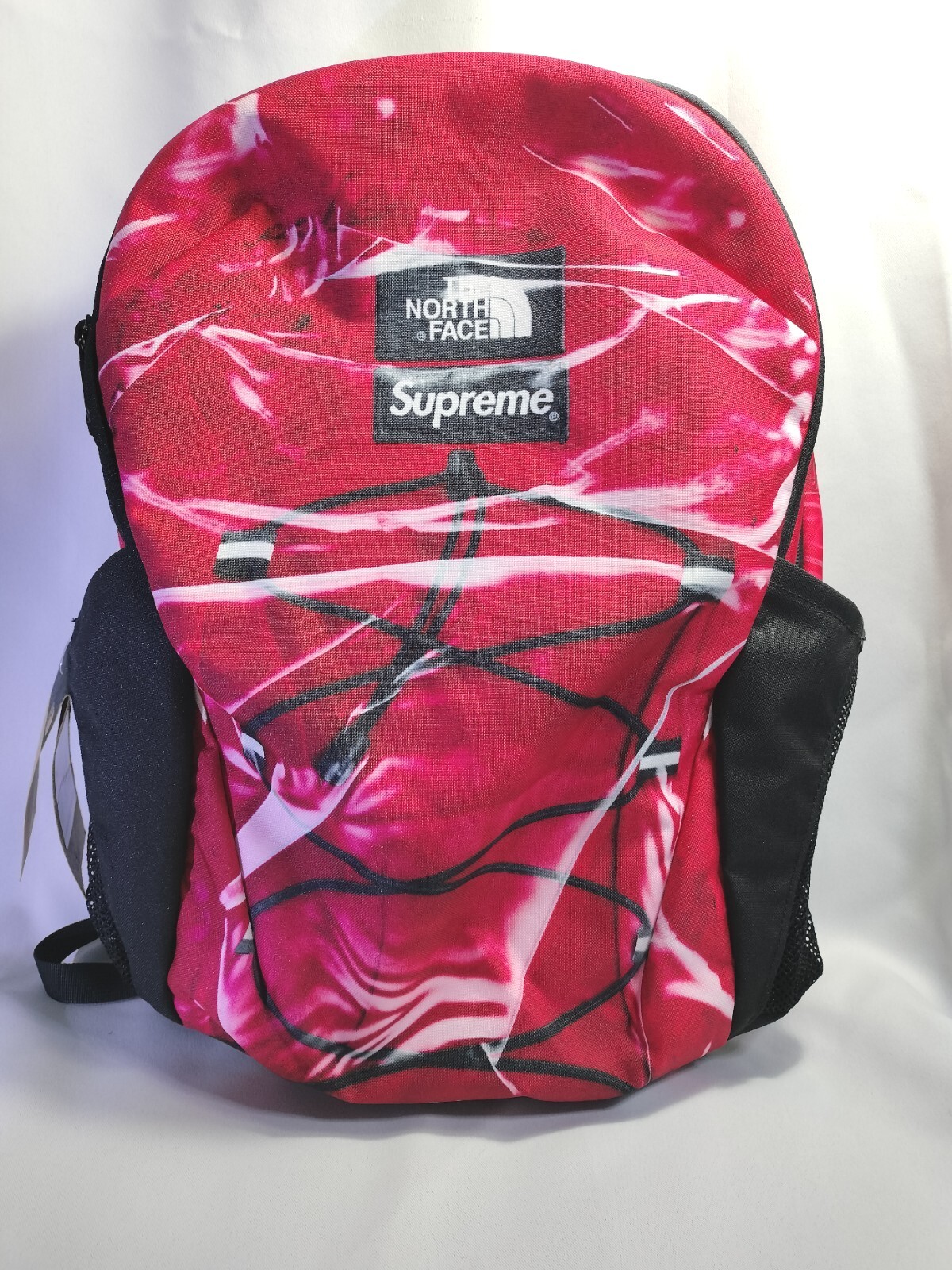 This supremely stylish backpack is the ultimate accessory for any adventure-loving man. With a trompe l'oeil print that mimics the iconic North Face design, this limited edition backpack is a collaboration between Supreme and The North Face, making it a must-have piece for any fashion-conscious traveler. Description: Supreme x Northface backpack Brand new with tags Hard to find