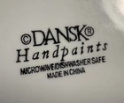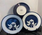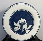 Add a touch of elegance to your dinnerware with this set of three luncheon plates from Dansk's Sureau collection. The plates feature a beautiful cobalt blue color with white leaves, adding a pop of color to your table setting. Measuring 9 inches in diameter and made of durable ceramic material, these plates are perfect for serving lunch or salad. The vintage backstamp and floral theme add to the charm of this set. The set includes three salad or luncheon plates, making it a great addition to your existing dinnerware collection. There is some wear on these plates. The surfaces have scratches from a knife possibly, there is some crazing, one chip on front edge of one plate and a surface crack on the back of one plate that does not go through to the front. Please examine photos closely. Price reflects wear.