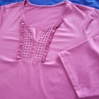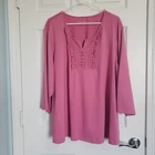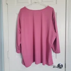 Susan Graver Pullover Top Womens Size 3X Liquid Knit. Ruffled and Applique detailing in front. 1/2 Sleeve. Liquid knit is 92% Polyester 8% Spandex for fit. Solid pink - photos against door are most representative of color. Pretty in Pink Boho Cottagecore Barbie vibes. Excellent condition. Returns accepted - buyer pays return shipping.