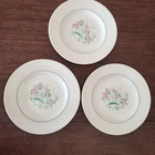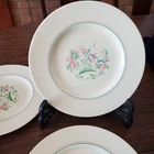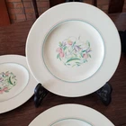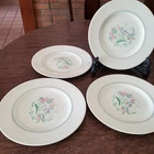 4 Susie Cooper 10 1/2" dinner plates circa 1930. Lovely Dresden Spray flower pattern. This pattern on the cream background is less common than the pastel backgrounds. I have tried to show pictures of the glaze flaws on the reverse. This is a nice opportunity to purchase Susie Cooper without importing from England.