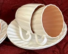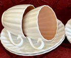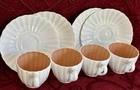 Susie Cooper Coffee Set Description Vintage C1950's 8 piece espresso coffee set designed by Susie Cooper for Wedgwood in their white and mushroom pink fluted/scalloped design. Made in England, the set comprises 4 x cups, 4 x saucers. All pieces are in excellent condition and the whole set presents beautifully with no chips or cracks with no obvious wear. Buy with confidence it is a gorgeous set in fine bone china and ready to use. The cups are espresso size and measure 6.5cms in diameter across the rim by 5.5cms high. The saucers measure 13cms in diameter across the rim. To see what else is available Click here to visit our store All sizes are approximate and p lease view the comprehensive photos as they do form part of the description. Payment Payment can be made by Paypal, bank deposit/transfer or cash on collection. Bank details are available when you go through checkout. Shipping All items are sent through Australia Post with tracking and will be posted within 2 business days of receiving payment. Always be assured that your purchases will be packed with the utmost care and attention and we are always happy to combine items.
