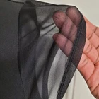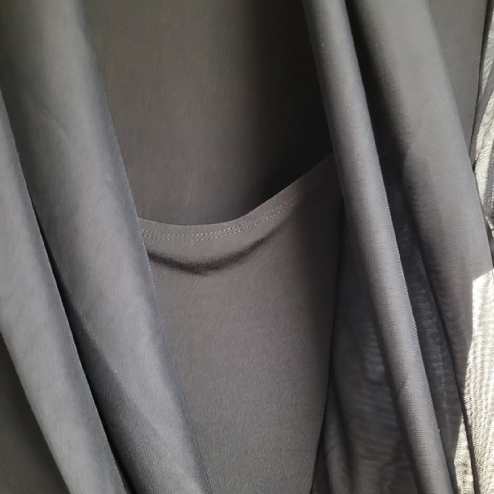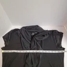 Suzie in the city black asymmetrical top with built in sheer scarf shawl Sheer short sleeves and a detailed sheet cut out on the lower angle side. Solid body (1 small snag in sleeve pictured above) Size: XL