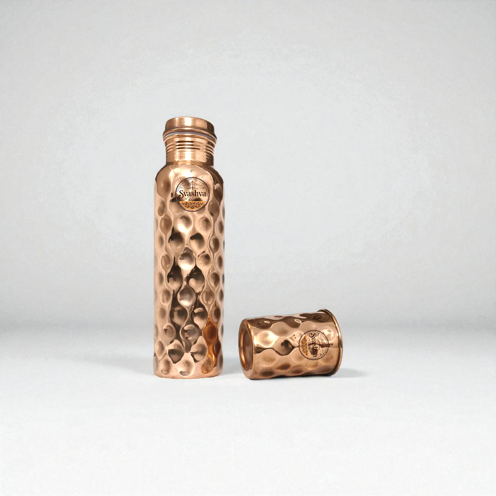 Elevate your hydration routine with this Premium Pure Copper Bottle & Cup Set from Svashva , crafted using traditional techniques and inspired by ancient Ayurvedic practices. Made from 100% pure copper and featuring a distinct deep dimpled Diamond design , this set is both elegant and beneficial for your well-being. What’s Included: 1 x Copper Water Bottle 1 x Copper Tumbler/Cup Product Features: 100% Pure Copper Made from uncoated, food-grade copper. No lining, no artificial polish – just pure, traditional copper. Unique Deep Hammered Pattern Features a modern twist on the hammered design for better grip and eye-catching shine. Perfect as décor or daily drinkware. Health Benefits (as per Ayurveda): May balance your body’s three doshas (Vata, Pitta, Kapha) Believed to enhance digestion and metabolism Known for anti-inflammatory and antimicrobial properties May aid in promoting healthy skin and immunity Leak-Resistant Lid Secure threaded cap prevents spillage. Travel-friendly and ideal for everyday use at home, work, gym, or yoga sessions. Eco-Friendly & Reusable Replace disposable plastic bottles and cups with this sustainable and natural option. Care Instructions: Cleaning: Use a mixture of lemon juice and salt or vinegar and salt. Rinse thoroughly. Do Not: Use in microwave or dishwasher. Avoid storing acidic liquids for extended periods. Natural tarnishing may occur, which is a sign of authentic copper and can be easily cleaned. Important Notes: Color, tone, and texture may vary slightly due to handcrafted production. Over time, copper naturally develops a patina – a protective layer that indicates purity. Why Choose This Set? Handmade by artisans using traditional methods Combines wellness, sustainability, and aesthetics Great for personal use or as a wellness gift Perfect For: Yoga, meditation, Ayurveda practitioners Health-conscious individuals Corporate gifts, housewarmings, birthdays, or festive occasions International Buyers (including USA): Import duties, taxes, and charges are not included in the item price or shipping cost. Customer may have to pay 25-50% custom import duty at the time of delivery.