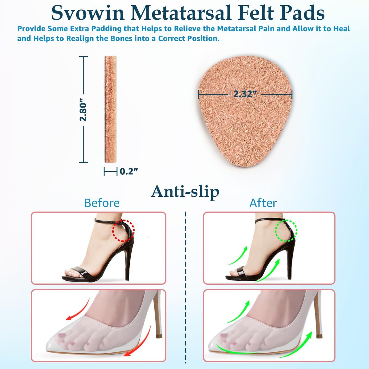 Svowin 8-Pack Wool Felt Metatarsal Foot Pads Shoe Insoles for Morton's Neuroma, Self-Adhesive Gel Ball of Foot Cushions Inserts for High Heels, 0.2'' Thick Non-Slip Forefoot Support (Black+Beige) Svowin 8-Pack Wool Felt Metatarsal Foot Pads Shoe Insoles for Morton's Neuroma, Self-adhesive Gel (Bottom) Ball of Foot Cushions Inserts for High Heels, 0.2'' Thick Non-slip Forefoot Support for Women Men Tapered edge design fits perfectly in the ball of your foot, relax the tense forefoot muscles, improves blood circulation. Perhaps you may feel uncomfortable or even painful when you first use our pads, so continue to use it. After a period of use, provide some extra padding that helps to relieve the metatarsal pain and allow it to heal, realign the bones into a correct position. BALL OF FOOT CUSHIONFOR For MORTON'S NEUROMA: 0.2 inch thick, will not compress down, they do not add height to insoles, comfortable and put just the right amount of lift to reduce pressure on the ball.The felt pads that is so comfortable and easy on the feet, nearly undetectable when standing, walking,hiking, add to the comfort, the edge shape cushions and diffuses the pressure off of the bones & joints. REDUCE METATARSAL FOOT PAIN:Our forefoot shoe inserts can provide all day cushioning and absorbs shock, keep your feet from slipping forward downward, and add nice padding in the shoe, help the ball of your feet to prevent rub and blister, forefoot pads for calluses, bunions, corns, morton neuromas. The anti-slip metatarsal pads block the body's gravity and forefoot pressure well and fits the foot shape. Self-adhesive Wool Felt( Reusable and Washable):Made of wool felt, not absorb moisture, is deodorization.The bottom is self-adhesive gel, not glue, will stay in your shoes firmly,there is no residue on the bottom of your foot when removing the pad.If it loses stickiness, please clean it with water to maintain stickiness. FIT MOST SHOES: Designed to wear with shoes, socks or barefoot. They fit perfectly on any high heels, open toe shoes, flat sandals, running shoes, dress shoes, boots, sports shoes, work shoes, leather shoes, etc. Not for tight shoes. TRUSTED QUALITY ASSURANCE - If you are not satisfied with this purchase, please feel free to contact us with your order ID and tell us how would you like us to help, we will try our best to offer the most responsible solution. Moreover, We do not suggest customer return opened products to Amazon warehouse in case used products being resold to other customers. Shipping from the USA All of our products are shipped from the USA, ensuring quick delivery to your destination. Payment We offer the following payment methods: PayPal, credit card, bank transfer, and eBay's secure payment system. Free Shipping & Free Returns Shipping within the USA is FREE. Additionally, any return is absolutely free for you. Risk-Free Purchase You have the option to return an item within 30 days without any justification. We cover the return shipping costs! Fast Shipping We ship immediately upon receipt of payment. Generally, the package is delivered within 2-3 days in the USA. If it takes longer, we will contact you. Quality and Costs Made in Europe, USA, China No customs fees or additional charges Total satisfaction guarantee Invoice with declared VAT available upon request in .pdf format Feedback Your feedback is very important to us. After you pay for your purchase, you will automatically receive positive feedback from us.
