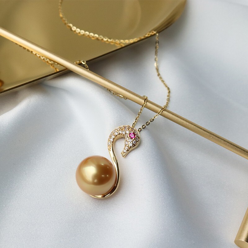 Swan Style 14mm South Sea Gold Pearl Pendant Necklace, 18K Gold, Rich Gold Color
