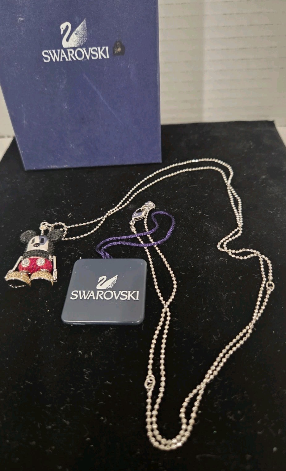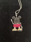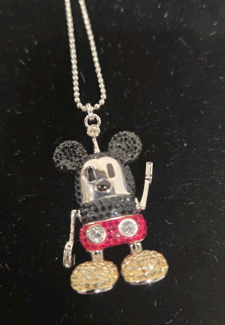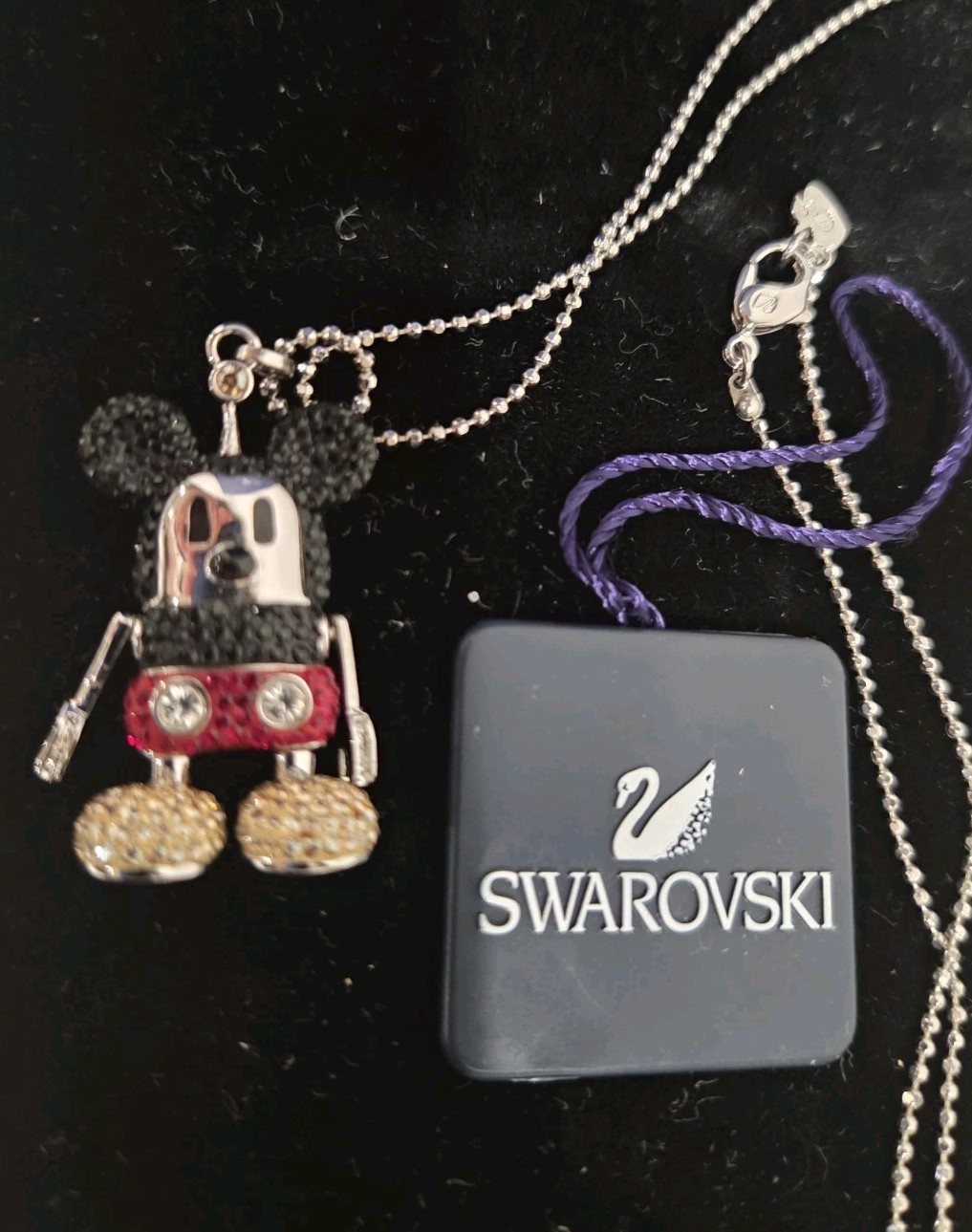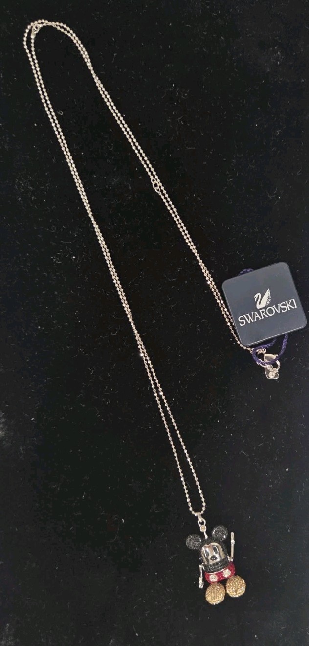 The Swarovski 3D Mickey Mouse Long Pendant is an authentic Disney jewelry piece featuring a moveable 3D-head, arms, and legs. Made of metal and Swarovski crystal, this fashion pendant is rhodium plated and adorned with multicolor crystals. Packaged in the original Swarovski box, this pendant is a charming addition to any jewelry collection, measuring 70mm in size. The intricate design and attention to detail make it a delightful gift for any Disney fan.