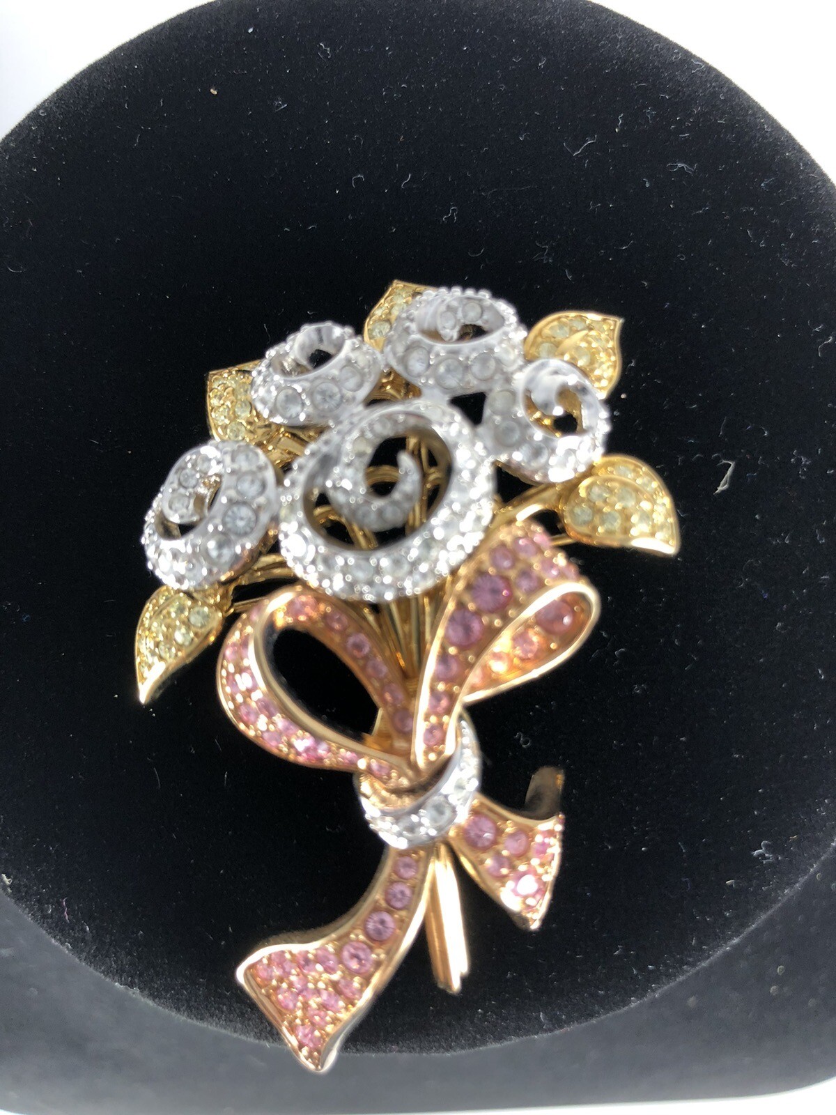 This stunning Swarovski brooch is crafted with pink and clear crystals in the shape of a beautiful flower bouquet. The intricate design and impeccable craftsmanship make it a truly unique piece of vintage jewelry. The brand name Swarovski is synonymous with elegance and luxury, and this brooch is no exception. The brooch is perfect for adding a touch of sophistication to any outfit and is sure to be a cherished addition to any jewelry collection. Whether you're looking for a gift for a loved one or a treat for yourself, this Swarovski "Compassion" flower bouquet brooch is an excellent choice. Please view photos before purchasing. If you have any questions please contact me.