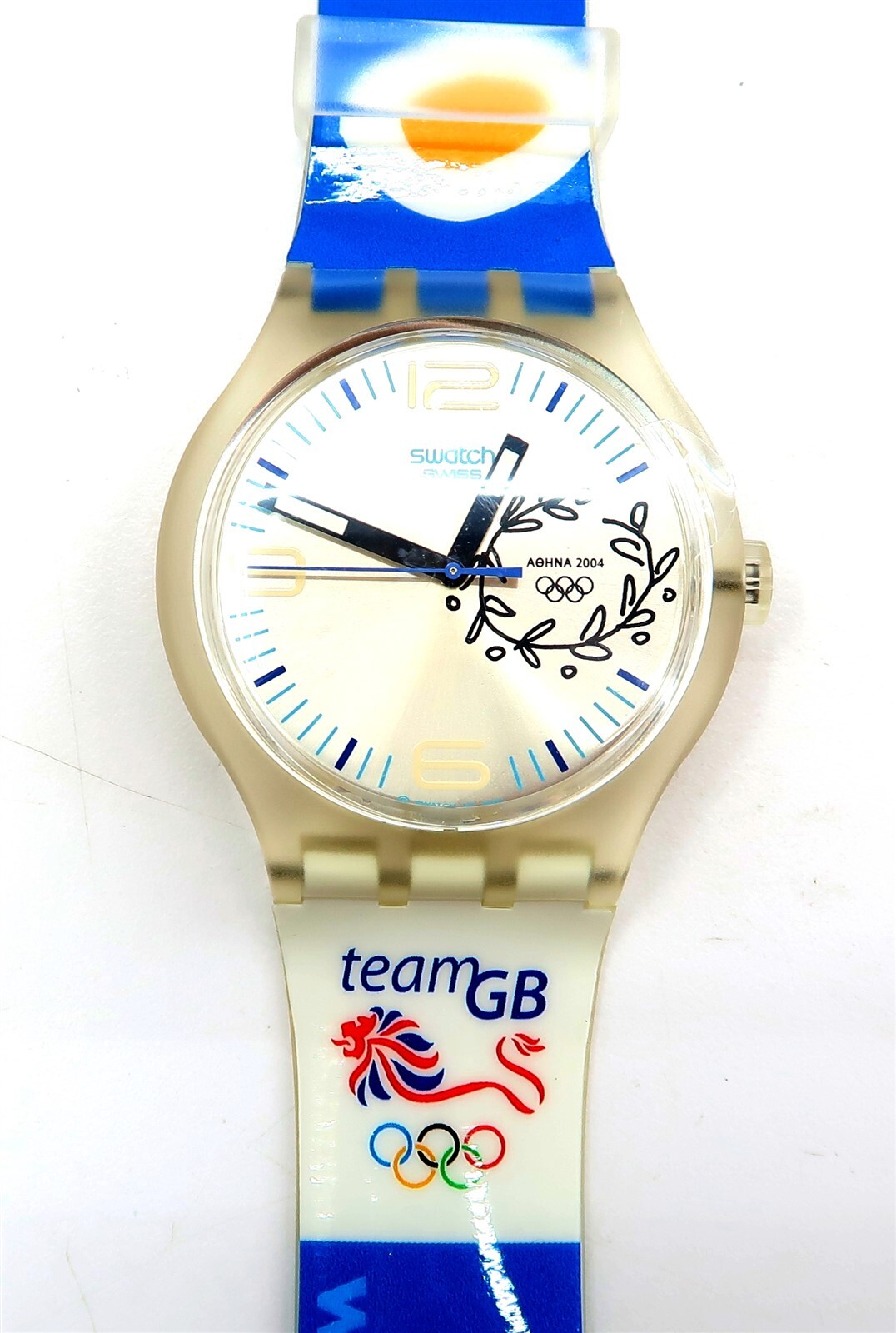 NEW Swatch Watch NOC UNITED KINGDOM SUDK106S 2004 Athens Olympic Games X-Large This eBay listing is for a New Old Stock classic SWATCH WATCH that comes as you see pictured in the listing and noted above. This watch is brand new and never used before and comes with the original case and paperwork. If you collect classic Swatch Watches, then please check out my other listings in my ebay store for many more great Swatches!! I just picked up close to 800 NOS Swatches from a local auction where I'm told the consignor had one of the largest Swatch watch collection in the United States. This was their 3rd and final auction of Swatches. In total, I purchased close to 1500+ Swatches!! Many of the watches are Special Editions, Limited Editions, Boxed Sets, Scarce and rare models plus other vintage Swatches as well. I will remove all of the old Swatch batteries and will replaced them with brand new batteries to verify that they are all are all in good working condition unless noted below. Please note that vintage and retro Swatches are on the smaller size compared to modern style watches. Most standard Gents (mens) watches have a 33mm-34mm case. I will try to include a picture with each new listing showing the watch next to a standard ruler so that you can see the true size of this collectible Swatch watch. Swatch name : NOC UNITED KINGDOM (at least that is what I think this one is since it says Team GB with the British flag) Model : SUDK106S New Battery : Yes (due to age, the original battery was removed with a new battery installed) Features/Notes : Works Great! Circa 2004. Seller Location Reference - Box 94A BID IN CONFIDENCE – CHECK MY FEEDBACK! My goal is your satisfaction. I leave positive feedback right after the payment is received for all orders!! If you plan to leave anything less than positive feedback and 5 stars - please let me know so that I can work out any problems that you may have. I aim to please!! SHIPPING & HANDLING FOR US BIDDERS We ship ASAP upon payment as noted above within 1 business day 99% of the time!! We normally pack up your new treasures 2 - 3 times a day and ship using USPS and Fedex Ground so that you get your items in a timely fashion. As always - there is no charge for local pickup on any of my items!! SHIPPING AND HANDLING FOR INTERNATIONAL BIDDERS Import duties, taxes and charges are not included in the item price or shipping charges. These charges are the buyer’s responsibility. Please check with your country’s customs office to determine what these additional costs will be prior to bidding/buying.” THANK YOU AND HAVE A WONDERFUL DAY!! Powered by SixBit's eCommerce Solution