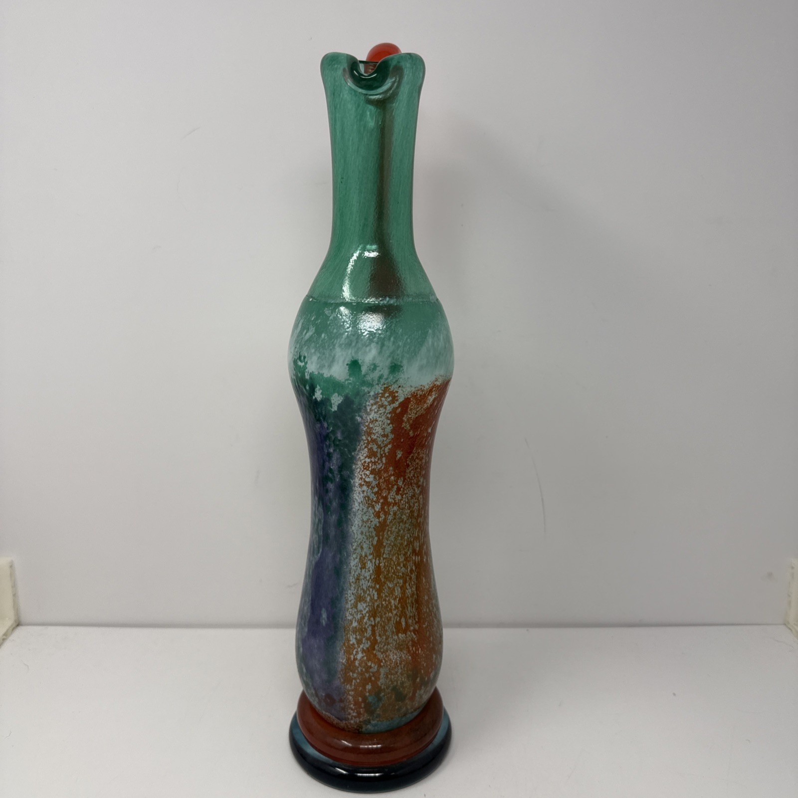 The Sweden Kosta Boda art glass Kjell Engman Wedding CanCan Wedding Jug is a stunning 16-inch pitcher that showcases the contemporary style and art glass production techniques of Swedish craftsmanship. Hand-blown from glossy multicolor glass, this original vintage piece from the 1980s exudes a festive and elegant charm perfect for any wedding or special occasion. With its unique design and high-quality material, this pitcher adds a touch of sophistication and creativity to any collection or table setting. Beautiful piece and very well made. Weighs almost 5 pounds. Please refer to photos for best idea of style and condition!