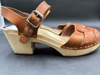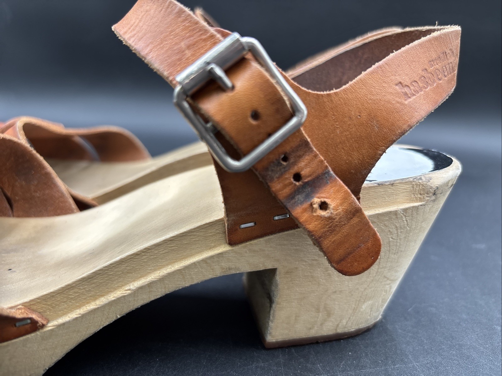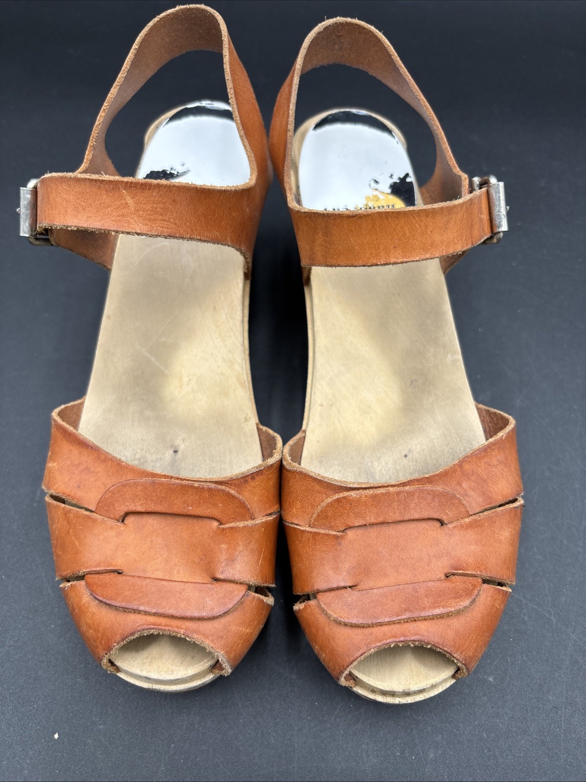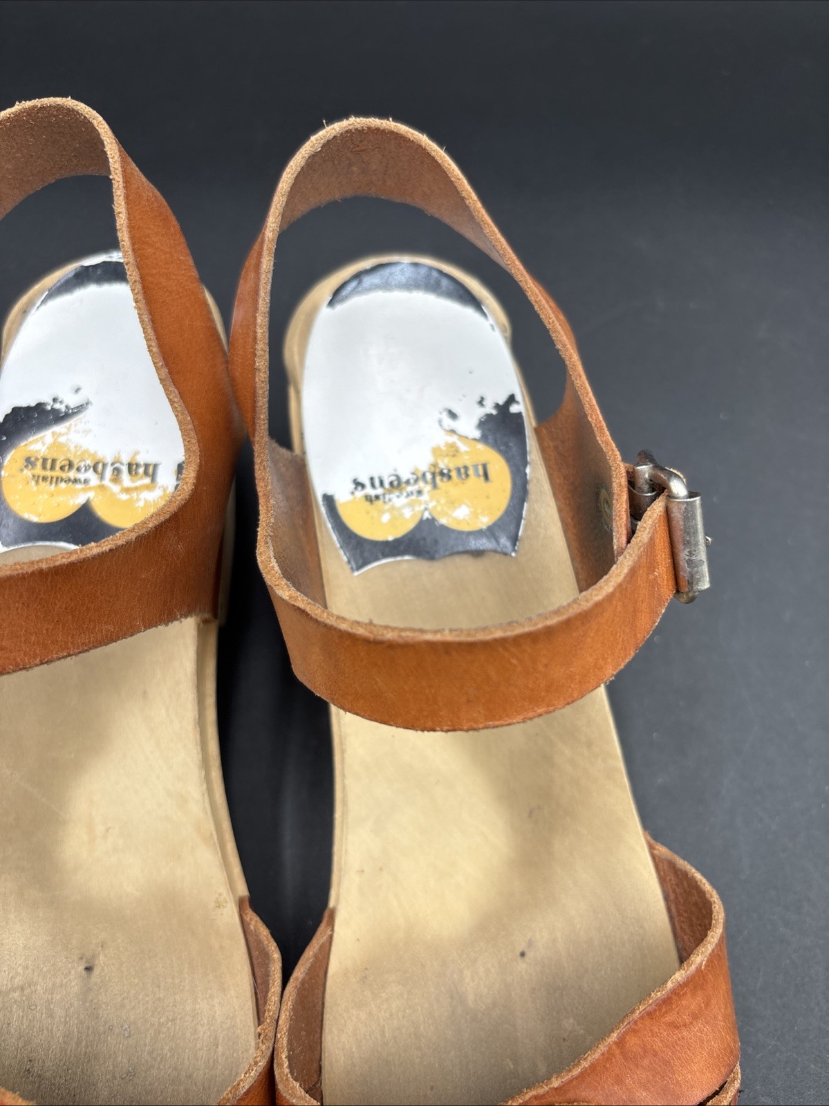 The Swedish Hasbeens 38 US 7.5 Tan Leather Peep Toe Wooden Clog Sandals 1215-14 are stylish and versatile women's sandals perfect for a casual or travel outfit. Featuring a solid brown color, strappy design, and mid-height block heel, these sandals offer a comfortable and fashionable option for the summer and spring seasons. The peep toe design and wooden clogs add a touch of nature-inspired charm, making them a great choice for those who appreciate a bohemian or peasant-inspired look. Made of high-quality leather, these sandals from the renowned Swedish Hasbeens brand are a must-have for any fashion-forward woman.