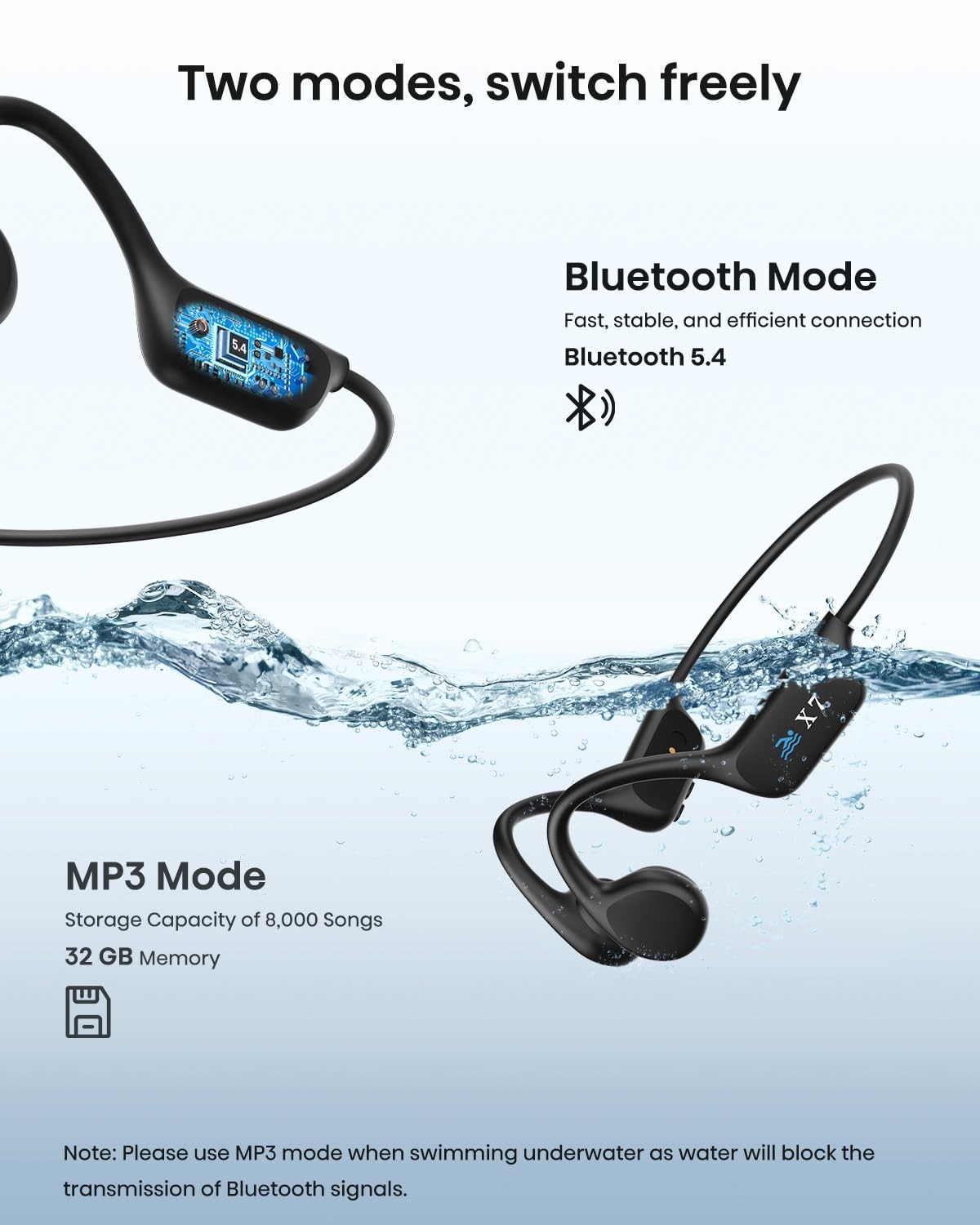 underwater headphones for swimming --SOFTWARE & HARDWARE CONFIGURATION-- Bluetooth 5.4 Technology With Mic: Built-in Microphones Charging Voltage:5V-180MA Sport Headphones Battery Type: Lithium polymer battery Battery:200 mAh Charging Time: About 2H Using Time: 8-10H Waterproof Level: IP68 Bluetooth Reception Distance:10m Headphones Weight:32.4g Wireless Material: PC & ABS & Titanium --PACKAGE LISTING-- Swimming Headphones * 1 Charging Cable * 2 Headset Manual * 1 IP68 Waterproof Design - Waterproof Headphones For Swimming, can be used with a swimming cap, goggles and earplugs, lightweight and comfortable. IP68 Waterproof Rating is completely waterproof, sweatproof, rainproof and dustproof, which makes them ideal for swimming, snorkeling, fishing and boating. Note: Bluetooth connection is not supported underwater, please switch to MP3 Mode. Built-in 32G MP3 Memory - swimming underwater headphones built-in 32GB storage, capable of storing up to 6,000 songs and support multiple formats like MP3, WMA, WAV, APE, FLAC formats. Note: Double-click the power button to switch between Bluetooth mode and MP3 mode. Bluetooth 5.4-bone conduction headphones adopts Bluetooth 5.4 technology, which ensures a stable Bluetooth connection, high-efficiency and durability, and a maximum Bluetooth connection range of 33 feet (10 meters). Compatible with iOS and Android devices, you can listen to music, audiobooks and make calls. Long Battery Life - Open Earphones Bluetooth is equipped with a 200mAh large battery. After charging for 2 hours, you can enjoy up to 8 hours of playback or talk time. Multi-function button Design - allows you to easily switch between two modes, play, pause, previous/next song, and answer/hang up calls, bringing you a fast and simple use experience. Safe and Comfortable - wireless earphones weigh only 30 grams, with open-ear design and comfortable to wear. Pay attention to your surroundings while enjoying the music, perfect for indoor and outdoor activities such as running, cycling, exercising, etc., ensuring you are safe wherever you go. After-sales service - Provide 24-hour after-sales service to provide you with a satisfactory answer. Please feel free to contact us at any time.