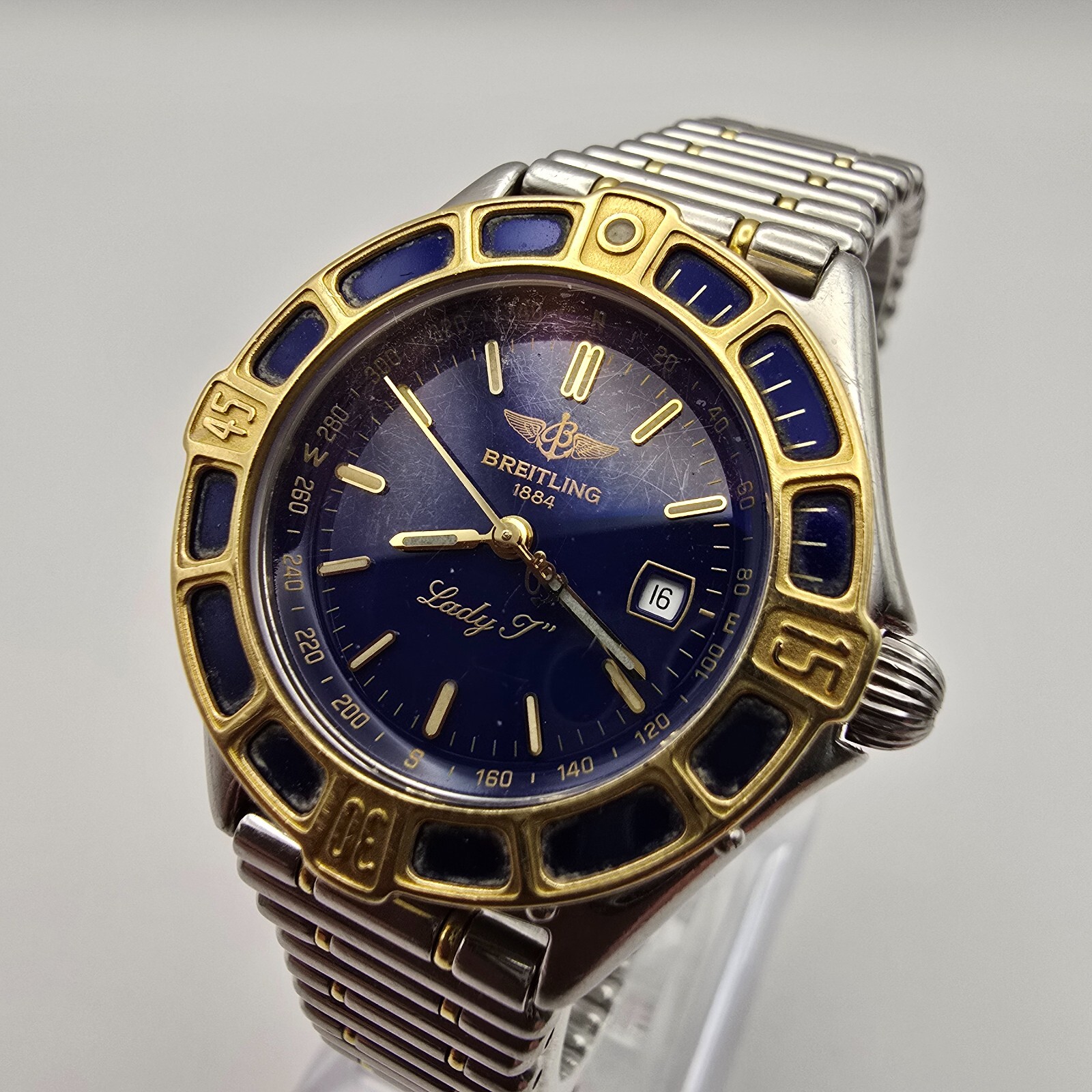 This stunning vintage Breitling Lady J watch is a true gem! The elegant yellow gold and stainless steel combo paired with the striking sunburst blue dial makes it a head-turner. It's in fantastic condition for its age, with only minor wear like a small knock on the crown. The sapphire crystal and date function add practicality to its beauty. The bracelet fits comfortably, and the gold bezel still shines brightly. A rare find for any collector—works perfectly and looks even better in person. Definitely worth every penny for such a timeless piece!