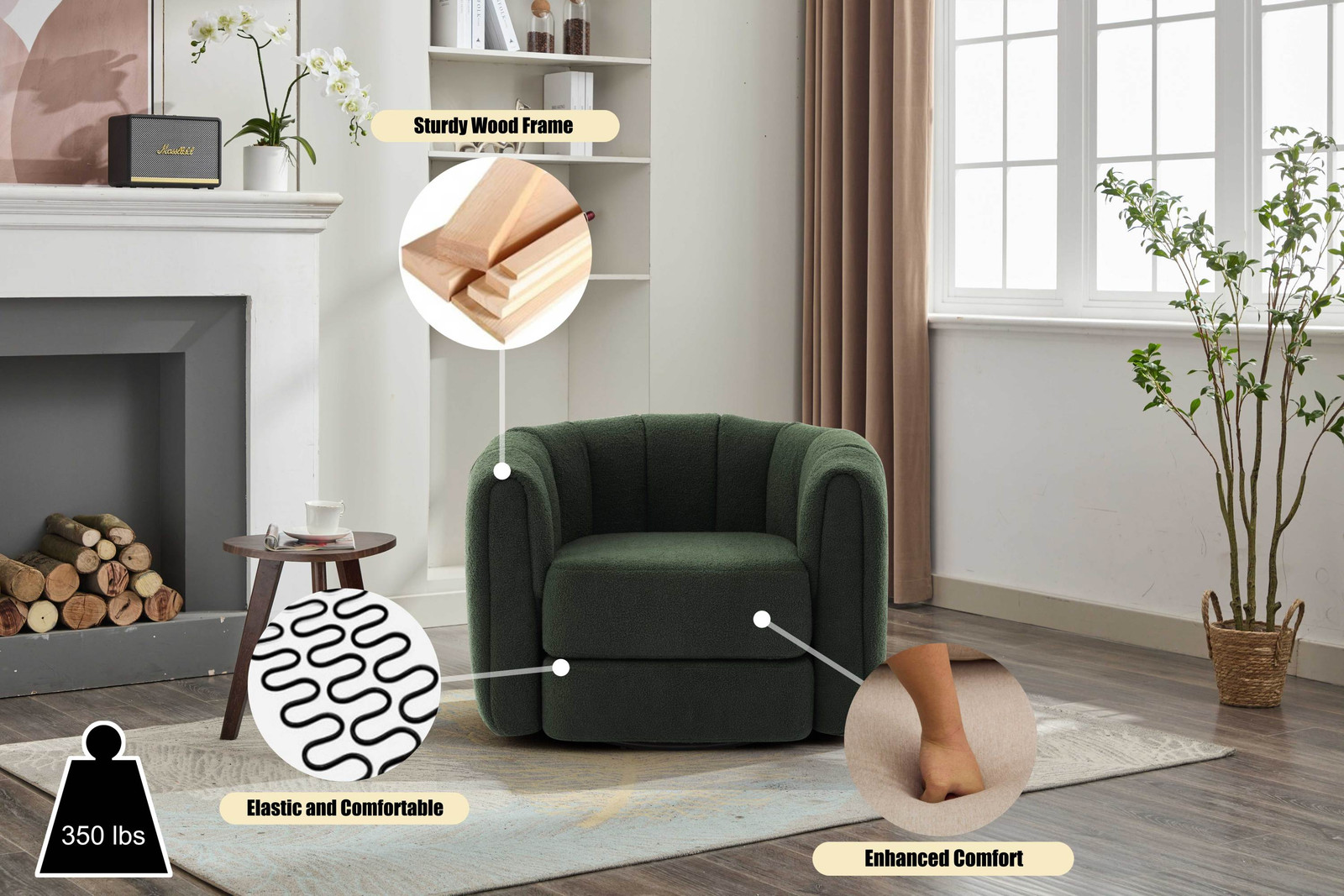 Specifications Place of Origin #originPlace# Main Color Green+Dark Green Main Material Teddy Dangerous Goods #dangerFlag# Dimensions & Weights Assembled Length (in.) 29.53 Assembled Width (in.) 37.01 Assembled Height (in.) 27.56 Weight (lbs) 49.20 Product Features [360-Degree Swivel Comfort] - Immerse yourself in this bucket design swivel sofa accent chair that effortlessly rotates 360 degrees, allowing you to find the most comfortable posture with stability. Unlike ordinary armchairs, this piece seamlessly combines modern style with practical functionality, making it a stylish addition that enhances any room. [Sturdy Build & Premium Materials] - Clad in soft fabric, this swivel barrel armchair combines elegance with easy maintenance. Supported by a sturdy solid wood frame, it holds up to 400 pounds, promising durability. Filled with high-density sponge throughout, from the seat cushion to the backrest and armrests, this comfy chair ensures a plush and resilient seating experience. [Premium Teddy Fabric]The surface of the barrel chair is made of soft teddy fabric, super soft and skin-friendly. The curved backrest and thickened seat cushion are filled with high-density sponge, elastic and not easy to collapse, providing a comfortable experience for a long time! [Perfect Size] - Whether you crave a snug retreat or a plush backrest for ultimate relaxation, this D30.3' x W37' x H27.6' wide swivel barrel chair has got you covered. [5-Minute Quick Assembly] - Simple assembly steps, requiring only the installation of the armrest and back. Place it in a corner of your home that suits you best, instantly adding brightness and elegance to the entire space. The 360-degree swivel chair is ideal for cozy corners or arranged in multiples, allowing you to enjoy cherished moments with your family. Description