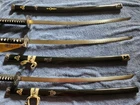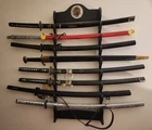 This sword collection features a variety of Japanese katana swords and a broadsword. There is the Kill Bill full set,a red damascus steel katana,the katana from the Highlander movie, a black steel katana with a strap,a white sheath blue with lightning blade katana,and a viking style broadsword. I obtained these swords for my collection, but I have decided to part ways.