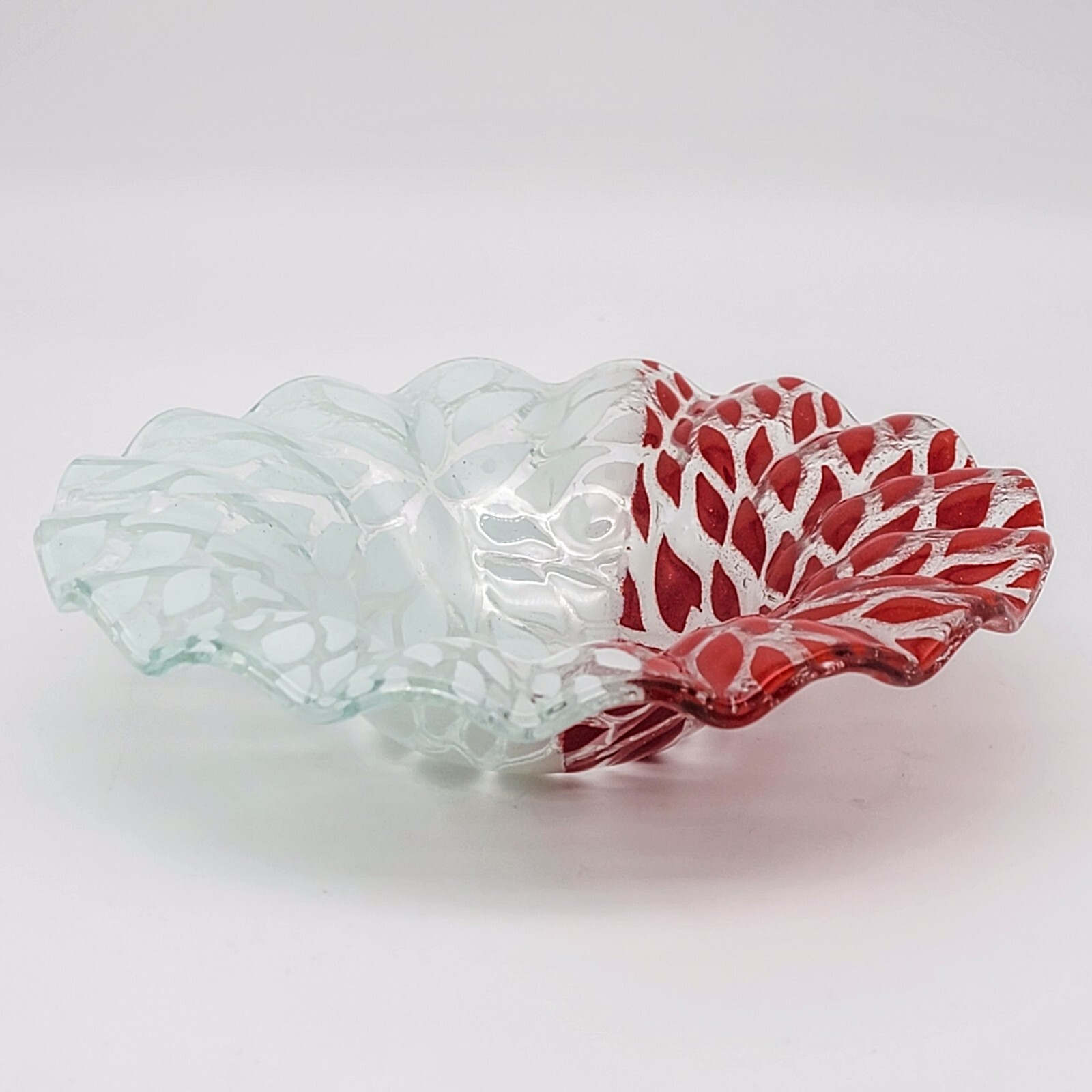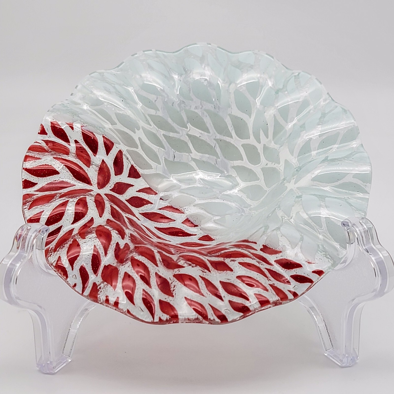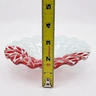 Sydenstricker Art Glass Signed Berry Bowl Red/White Chrysanthemums Trinket Dish 6.5" Diameter Bowl is a colorful red and white chrysanthemum pattern. Measures 6.5 inches in diameter and 1.5 inches in height. Handmade in the Brewster, MA using fused glass production technique, this original piece is signed by the artist. The bowl is perfect for serving fruit or as a decorative piece in any room. Used but in excellent condition. No chips, cracks, or scratches. See photos for details.