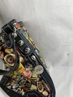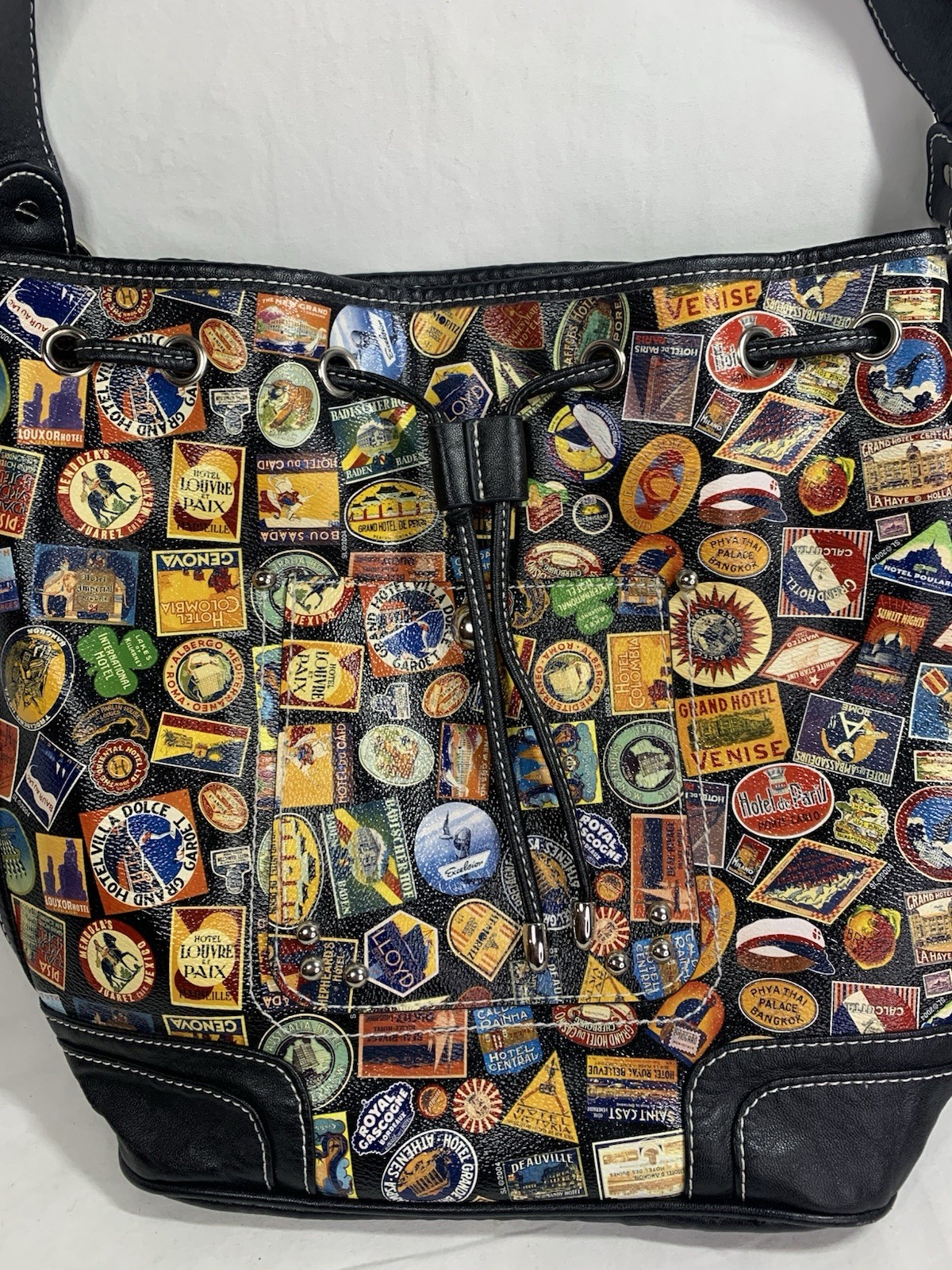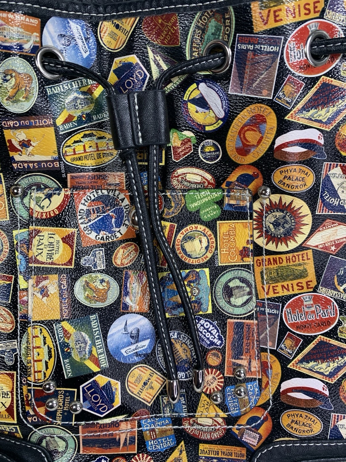 Explore the world with style and organization with the Sydney Love Travel Shoulder Bag. Crafted for the modern woman, this bag boasts a vibrant, multicolor exterior adorned with the iconic logo pattern, complemented by sleek black leather straps. It's an ideal companion for travel, offering ample space with its generous dimensions of 14 inches in width, 12 inches in height, and 5 inches in depth. The shoulder bag features a versatile closure system including drawstring, magnetic, snap, and zip options, ensuring your belongings are secure and easily accessible. The interior is thoughtfully lined with both nylon and fabric, enhancing the bag's durability and providing additional pockets for organization. Silver hardware, buckle accents, and a brand card with a bag charm add a touch of elegance to this functional and fashionable accessory.