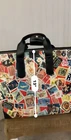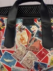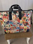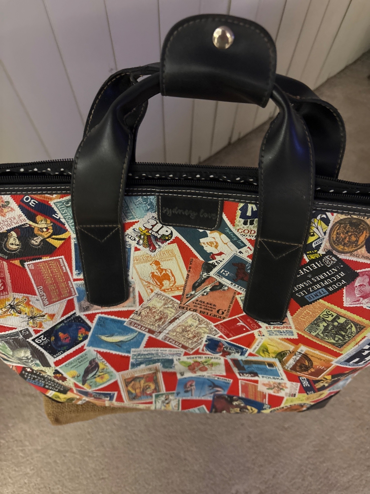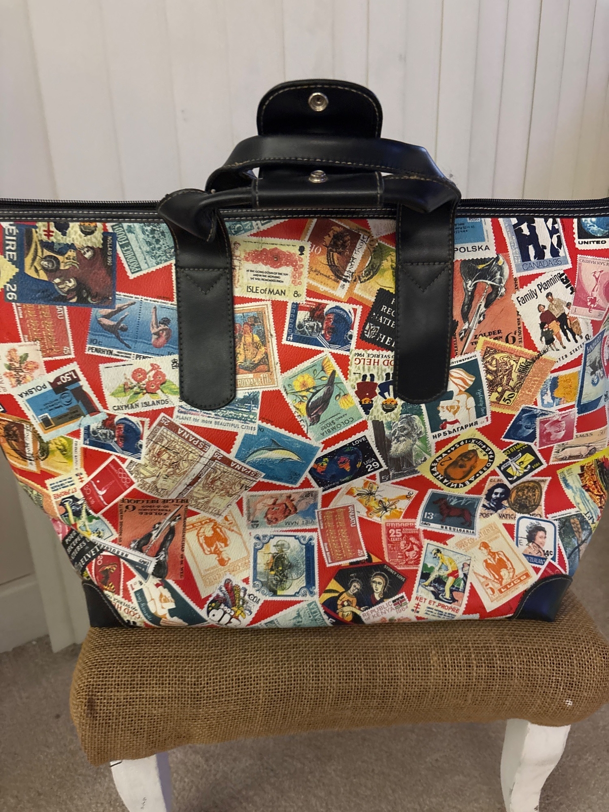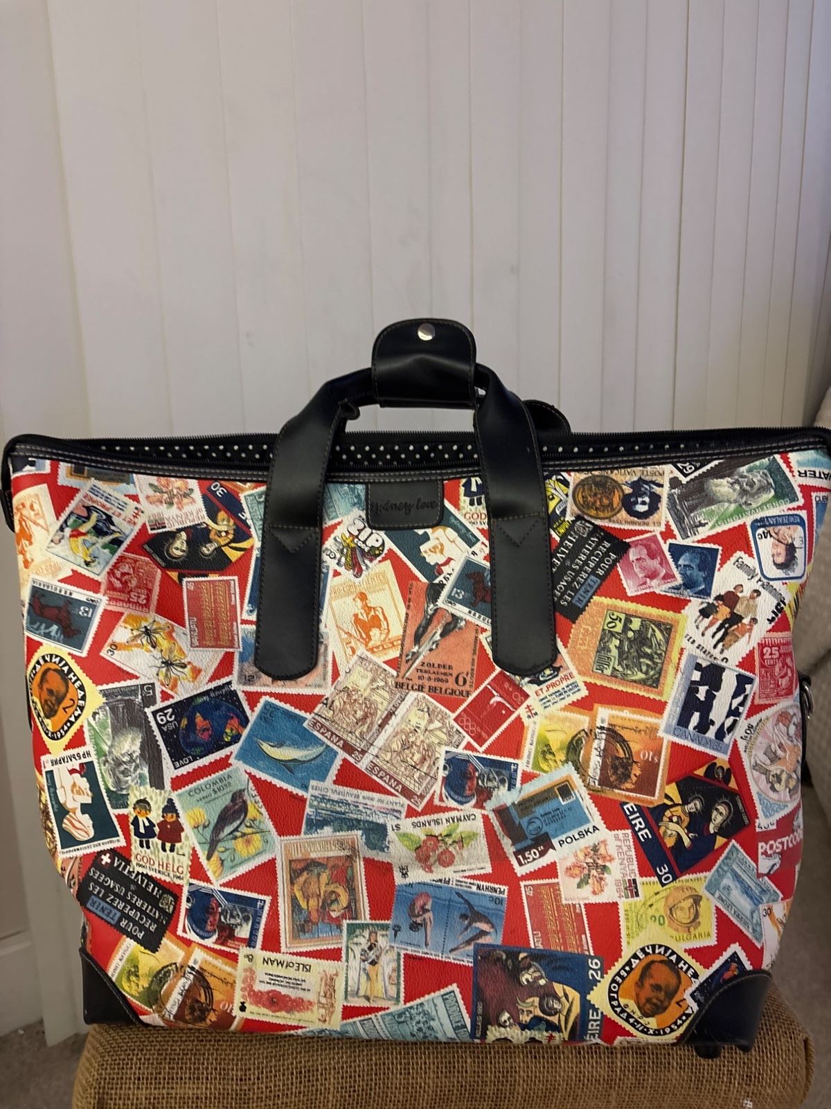 This bag is the perfect companion for those with a stamp of approval for fashion. With its vibrant design and sturdy build, it’s great for carrying your secrets or just your groceries. Extra large space see photos for measurements • Black leather handles • Zipper closure • Large capacity • Lightweight design See photos for measurements In great condition Please see all photos as they are part of the description. Always open to reasonable offers! Jewelry is never cleaned as we want to preserve its timeless beauty and aging. Vintage items tell a story and we would like you to see that story. It also allows the new owners to clean in a way that is right for them.