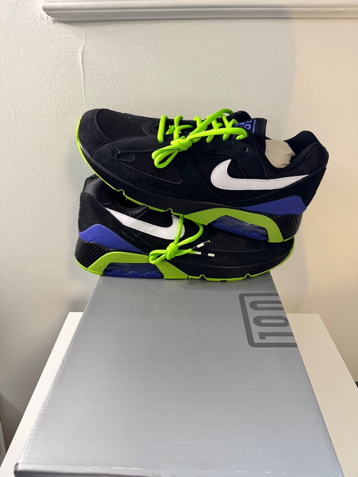 Elevate your athletic footwear collection with the Nike Air Max 180 QS Joker Black White Action Green. These sneakers are a vibrant addition to any outfit, featuring a colorful theme that stands out. Designed with a sleek black base, the Action Green accents give off a bold and energetic vibe, perfect for those who appreciate a touch of flair in their sporty style.The Nike Air Max 180 model, known for its comfortable and supportive fit, is ideal for a variety of activities including gym training, running, jogging, and even casual walks. The durable construction and the standard shoe width ensure a comfortable experience throughout the day. With the right size for US 10.5 / UK 9.5 / EU 44.5, these kicks are a versatile choice for the summer, spring, or fall seasons. BRAND NEW, NEVER WORN! GRAB A DEAL!