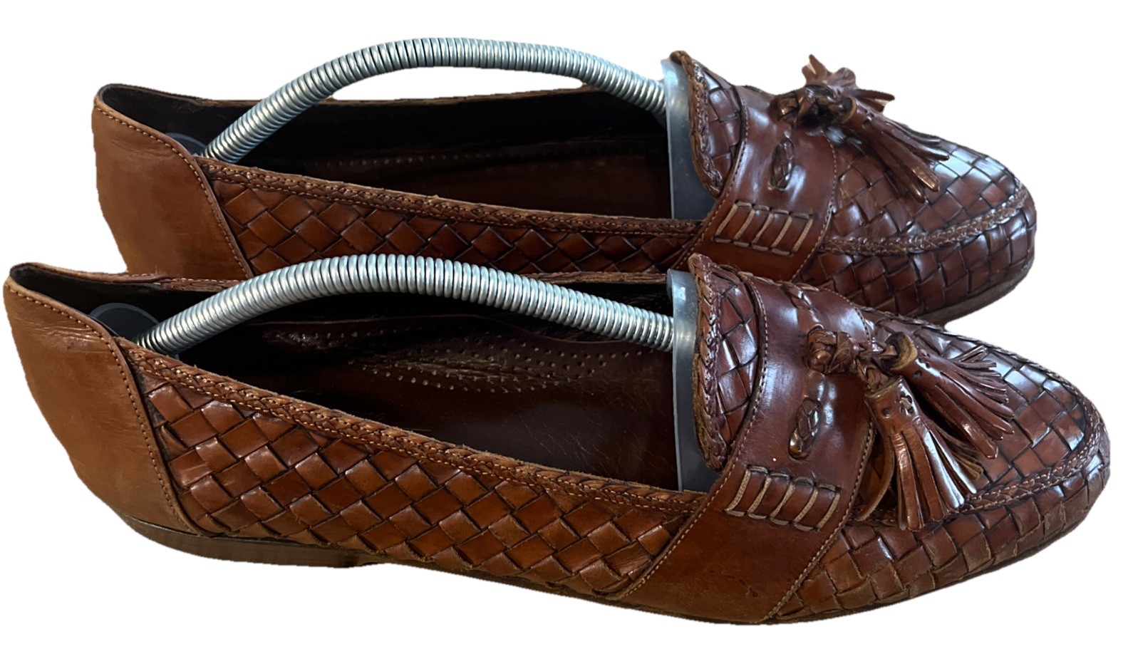The product is a size 11 formal pair of men's shoes, crafted with brown woven leather and featuring tasseled accents. Made in Italy by Bragano for Cole Haan, these slip-on loafers have a round toe shape and are designed for comfort with a cushioned insole. Perfect for various occasions such as business meetings or classic style events, these vintage-inspired shoes exude elegance and sophistication. The timeless design and high-quality leather materials make these loafers a versatile and stylish addition to any man's shoe collection.