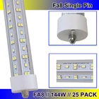 FAST DELIVERY - Ship from New Jersey or Los Angeles Warehouse via FedEx , 3-7 Days Delivered Your Door . SCIENTIFIC DESIGN - 8Ft LED Shop Lights Fixture is Made of 6500K Cold White SMD2835 LED Chip ,Plastic Clear Cover , Aluminum Bracket Housing ,and AC85-277V Constant Current Driver . It can work in -68F to 120F Temperature Conditions EASY INSTALLATION - The Integrated Tube Fixture Can be Install on Wall or Ceiling ,Easily Replace Traditional Fluorescent Tube Bulb . Plug and Play , Free Accessories (Power Cords, Connector , Extension Cords , Clip and Screw ) Come with Tube Lights Together WIDE APPLICATION - Linkable 8Ft Bulbs Widely Used in Garage Ceiling , Barbershop , Schools, Hospitals Basement , Factory Warehouses , Supermarkets Cooler Door , Offices, Shops,Hotels, etc T8 8FT LED Shop Light Bulbs 144W Single Pin FA8 8FOOT LED Shop Lights 25 PACK 【No RF & FM Interference】LED Driver have passed Electromagnetic Magnetic Compatibility EMC tests,No cause EMI ,No longer subject to any RF & FM jamming. Never interfering with the signal of your garage roller shutter door,No make noise when you listen radio 【Easy to Install】Just simply bypass the ballast and connection AC85-277V AC power . Not compatible with single-ended powered sockets 【Wide Application】 - 8Ft 144W V Shaped FA8 HO LED Bulb fitted to replace traditional F96T12 T8 T10 T12 fluorescent bulbs. Widely used in Garage,supermarkets, offices , convenience stores , gas stations , warehouse,parking lot,shops, hotels,Refrigerator,coolers or freezers illumination,etc 【High Output】8Ft 144W 18000LM FA8 【Rotate Cap & Swivel End】 Easy Adjust rotated Lighting Direction within 180 degree after Installation