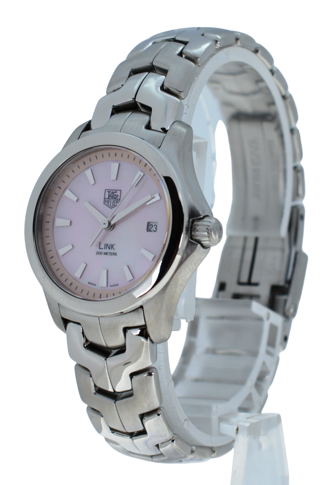 PRE-OWNED WOMAN'S TAG HEUER LINK WATCH SAPPHIRE CRYSTAL SWISS MADE ON DIAL ACTUALLY JAPANESE MOVEMENT MOTHER OF PEARL DIAL DATE DISPLAY CASE WITHOUT STEM 26.94 ABOUT 6 AROUND Elevate your style with this stunning silver TAG Heuer Link wristwatch. Crafted with Japanese precision, this luxury watch features a beautiful mother of pearl dial and a sleek silver stainless steel band. The watch is water-resistant up to 200 meters, making it perfect for any sport or formal occasion. The TAG Heuer Link is powered by a reliable quartz movement and comes without papers or original packaging. This wristwatch is the perfect accessory for any woman who wants to add a touch of sport and luxury to her wardrobe.