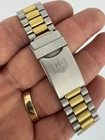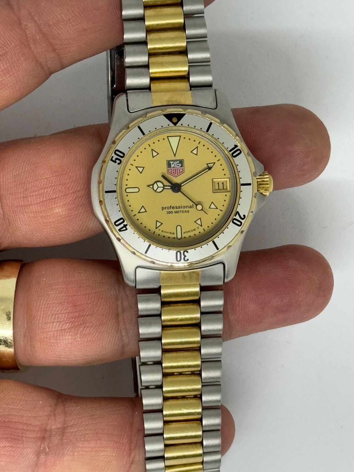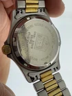 This TAG Heuer Professional 200 974.013F wristwatch is a vintage diver's and sport watch from the 1990s, featuring a round stainless steel case with gold-plated accents and a 34mm size. The watch has a Swiss quartz movement with 7 jewels, baton indexes on a gold dial, and a unisex two-tone stainless steel bracelet. With water resistance up to 200 meters, this TAG Heuer timepiece is a classic and stylish choice for both casual and water sports activities.