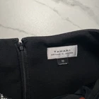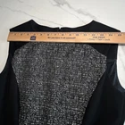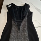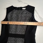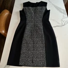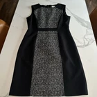 This Tahari dress is a sophisticated option for both parties and business events. The sleeveless sheath dress features a round neck and a knee-length hem, making it versatile for various occasions. Its black and white knit fabric gives a classic and city-inspired look, while the back slit adds a touch of modernity. The dress is lined and has a zip closure for easy wear, and it is made of a blend of polyester, rayon, and cotton. Perfect for size 10 regular women, this dress is a timeless addition to any wardrobe. Excellent, preowned condition. See photos for measurements.