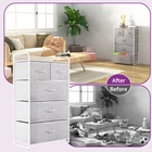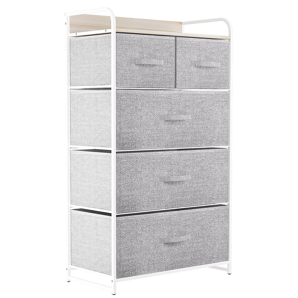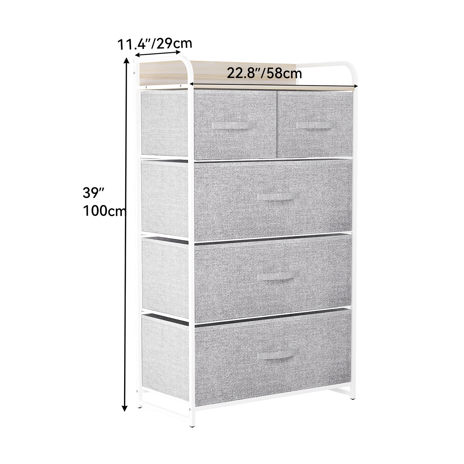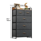 TAUS 5 Drawers Dresser Chest of Drawers Storage Tower Closet Organizer for Home QUALITY CONSTRUCTION- Made of reliable metal frame and durable MDF wooden top; 5 removable and foldable drawers; Easy pull wooden handles help conveniently open and close the drawers; 4 adjustable plastic feet help protect your floor from scratches. This occurs when the plates are installed in the wrong direction because the two small top drawers have bottom boards that are close to square. Rotate the bottom boards by 90°and try again. DURABLE FABRIC- The front side is made with high quality cationic fabric and other sides adopt breathable non-woven synthetic fabric; Easy Care - wipe clean with a damp cloth and allow to air dry. EASY TO ASSEMBLE- Detailed instructions and installation video will guide you through a hassle-free installation process, and hardware is included in the package so only fastening some screws will take energy. UNIVERSAL MATCH- Premium dark grey fabric drawers, sturdy white metal frame and waterproof wooden tabletop give the storage organizer a modern style. This unit easily fits in various living spaces: living rooms, bedrooms, hallways, entryways, closets and nurseries, etc. HIGH CAPACITY- 5 drawers of different sizes provide more storage choices, and sufficient space creates a neat and clean space for your bedroom or living room. Overall dimensions: 22.8"L" x 11.4 W x 39.4" H.Top drawer dimensions: 10.6 "L x 11" W x 7.5 "H. Bottom drawer dimensions: 21.3 "L" x 11 "W x 7.5" H.