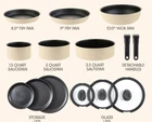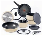 T-fal Ingenio Expertise nonstick cookware set. Vanilla color. NIB 14 piece set . Oven and broiler safe to 500°. Compatible with gas, electric, and induction stovetops. Dishwasher safe. Features detachable handles for easy stacking. PFAS free. Set includes 8.5" and 11" fry pans, 2 qt covered saucepan, 3 qt covered saucepan, 3.5 qt covered saucepan, 10.25" wok, two detachable handles and three storage lids. Stack height without the handles and lids is five inches. This set is an excellent choice for small kitchens, dorm kitchens, or RVs. All items from my smoke-free home IF YOU LIVE WITHIN 40 MILES OF ZIP 10596 WE CAN ARRANGE A MUTUALLY CONVENIENT PUBLIC PICKUP SPOT TO SAVE POSTAGE