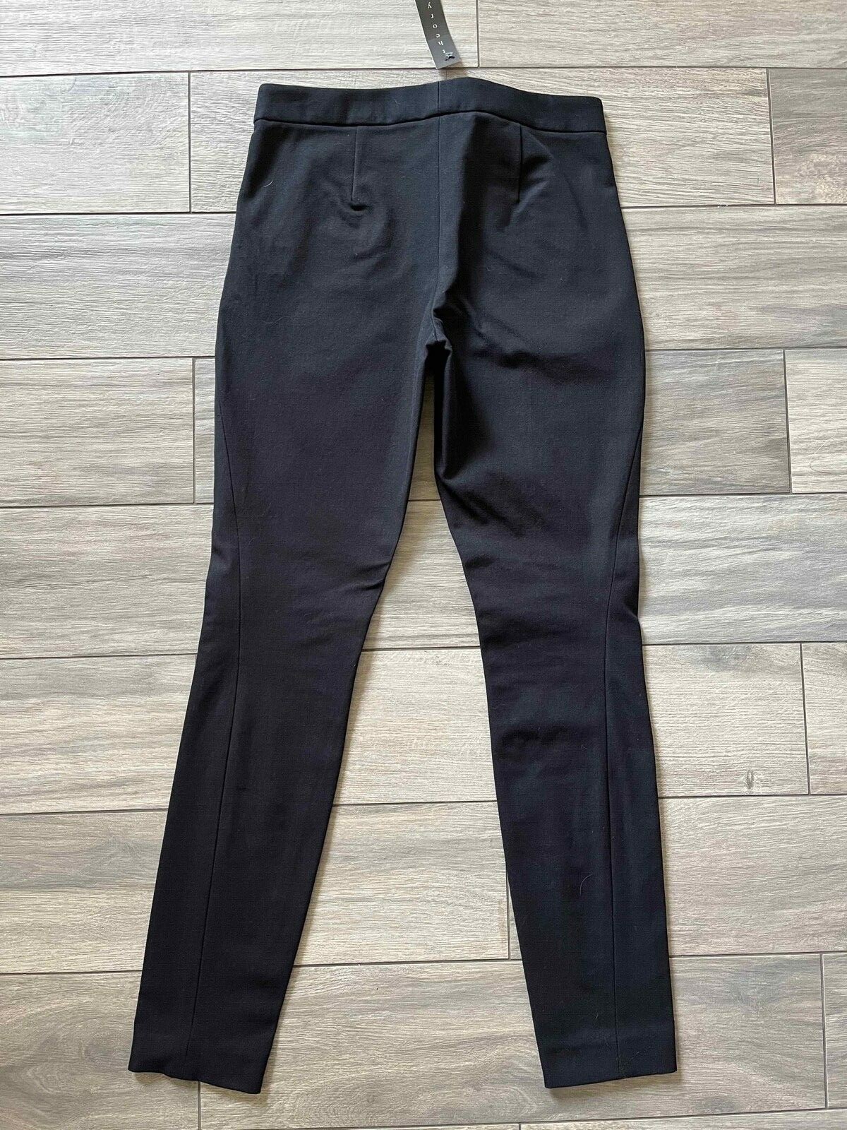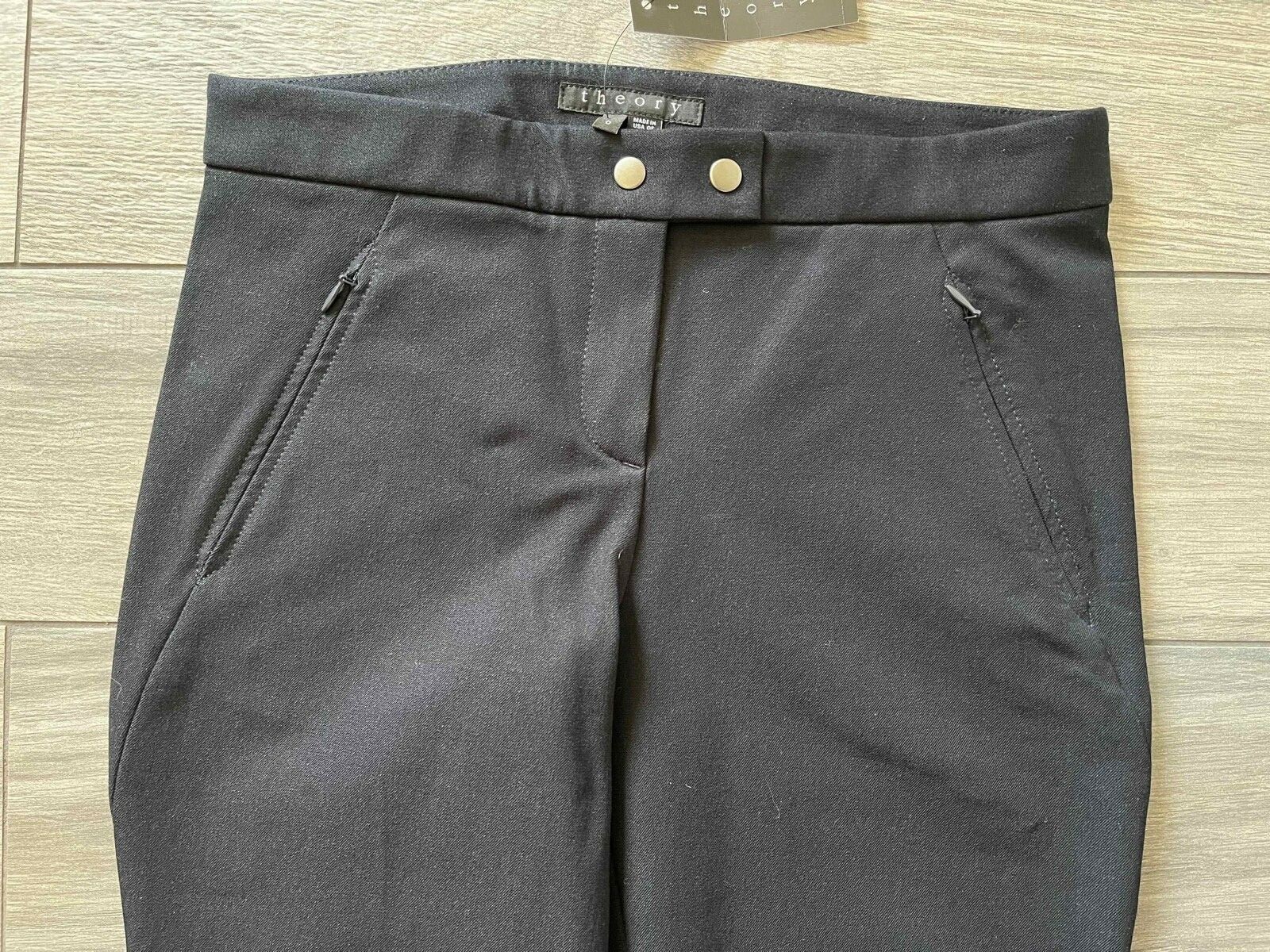 THEORY ADALWEN JETTY NAVY BLUE STRETCH PANTS, NWT $235, 0. These Theory Adalwen Jetty Navy Blue Stretch Pants are brand new with the tag attached. The product description is: Featuring a sleek fit and crafted from move-with-you fabric, these knit pants are sure to be a wardrobe workhorse. Zip fly with snap button closure, Zip pockets at sides, Viscose/nylon/polyurethane. These pants are a women's size 0. The measurements laying flat on the floor are: waist - 14 inches, rise - 8.5 inches and inseam - 29.5 inches.