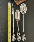 Stunning Set of THREE Rare Original Antique Lunt Monticello Sterling Silver Dining Serving Pieces β’ Olive Butter Cheese Set β’ Superb Stylish Examples β’ Kindly View Photo Gallery β’ 1.361 ozt Beautiful set of THREE fine extremely rare gleaming Lunt Monticello serving pieces, just perfect for your next celebration, party or holiday gathering. Glorious serving set includes one butter pick 6.5β, one pierced bowl olive spoon 6.4β, and one Stilton cheese scoop 5.5β. A stunning addition to any collection of American silver to be used and enjoyed for generations. Lightly hand polished to reveal luminous silver shine. Superb original examples in signature Monticello pattern by LUNT, c1908. Excellent antique condition with quality feel in hand. Sumptuous design featuring elegant classical cartouche motif. Sterile and ready to use. Happy Bidding!