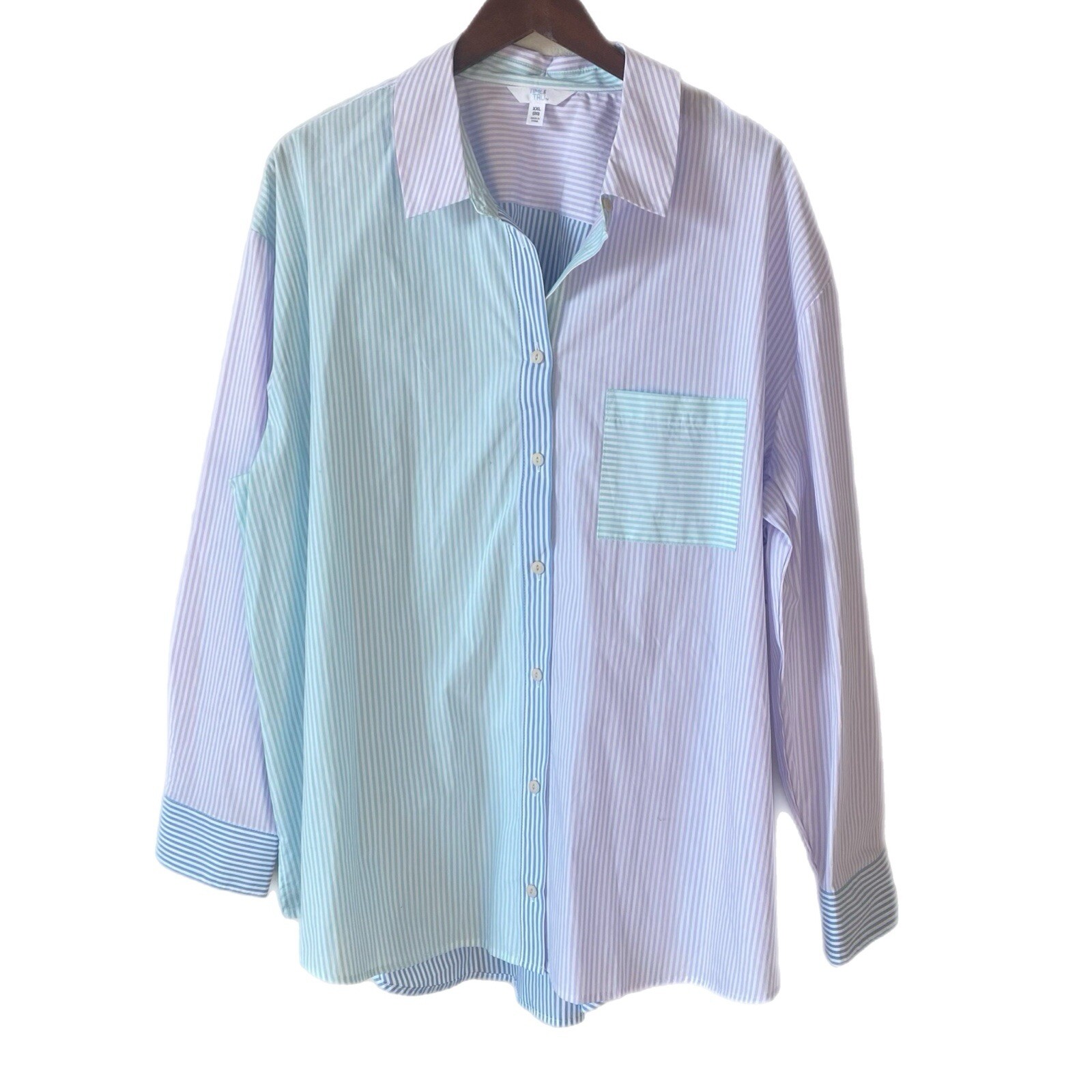 TIME AND TRU Shirt Top Blouse Tunic New With Tags 100% Cotton Purple Blue Green Striped Multi Chest Pocket Sz XXL (20) Underarm To Underarm = aprx 27” Length = aprx 29” (front) aprx 32” (back)